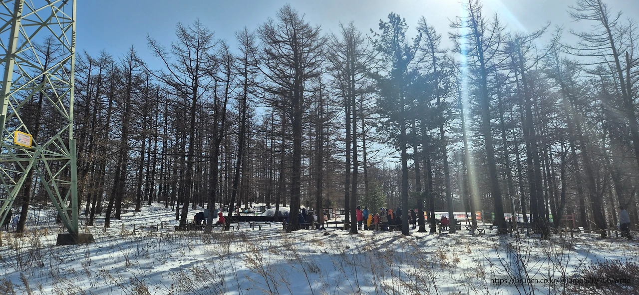바닥에는 눈이 쌓여 있고, 나무들은 마른 가지를 쭉 뻗고 있는 숲길에는 햇살이 가득 내린다. 눈 쌓인 숲길을 걸으면서 하늘을 보니 파란 하늘이 더 겨울 같은 차가운 느낌이지만, 나무들의 마른 줄기의 앙상함에 더 바람이 많이 불 것 같지만 마음은 결코 춥지 않은 숲길이다. 등산화가 아니라 조심스럽긴 하지만, 눈썰매 도구를 준비해 와서 눈썰매를 타는 가족들 옆을 지나면서 오히려 따뜻한 마음이 느껴지는 겨울 산이다.