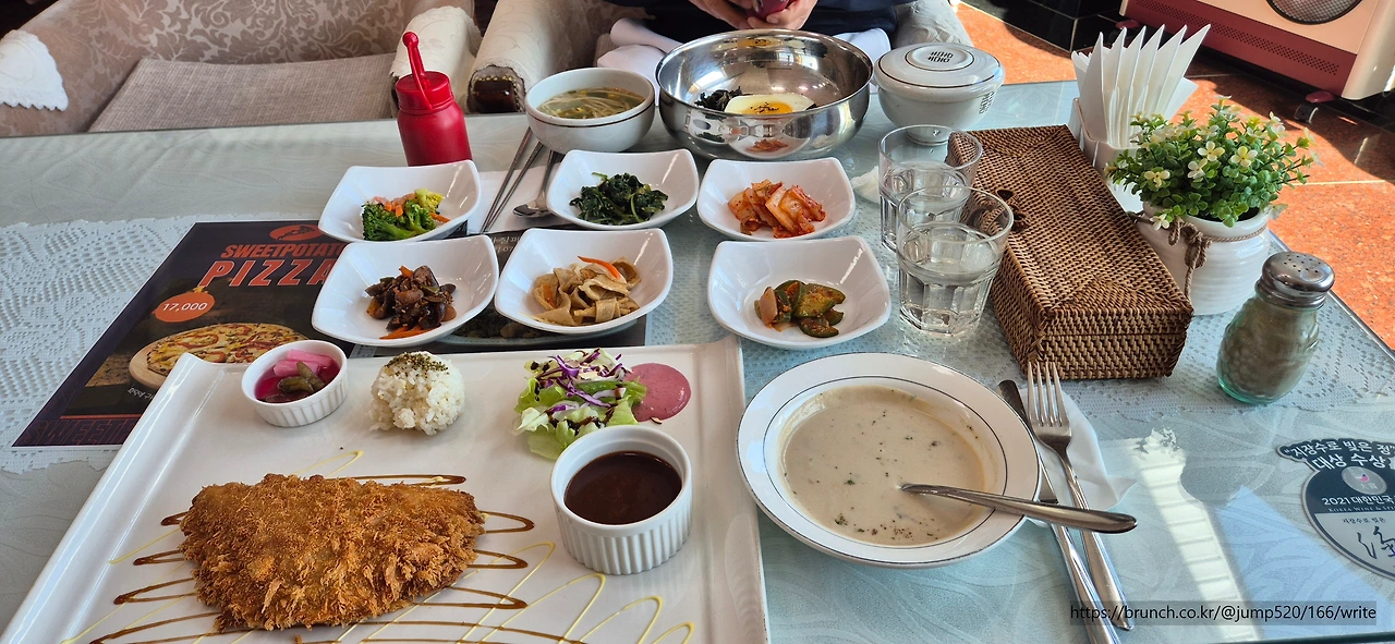 만항재를 내려와 태백방향으로 달리다 보면 산 중턱에 콘도와 함께 운영하는 레스토랑 겸 카페가 있다. 인적 드문 산 중턱이라 바라다보이는 능선이 아름답고 둘러싸인 높은 산이 만드는 경치가 참 아름다운 곳이다. 어느 해 지나다가 우연히 들렸던 곳인데 조용하고, 정성 담긴 상차림에 음식이 깔끔하고 맛있었던 기억이 남아 그 식당에 들렸다.