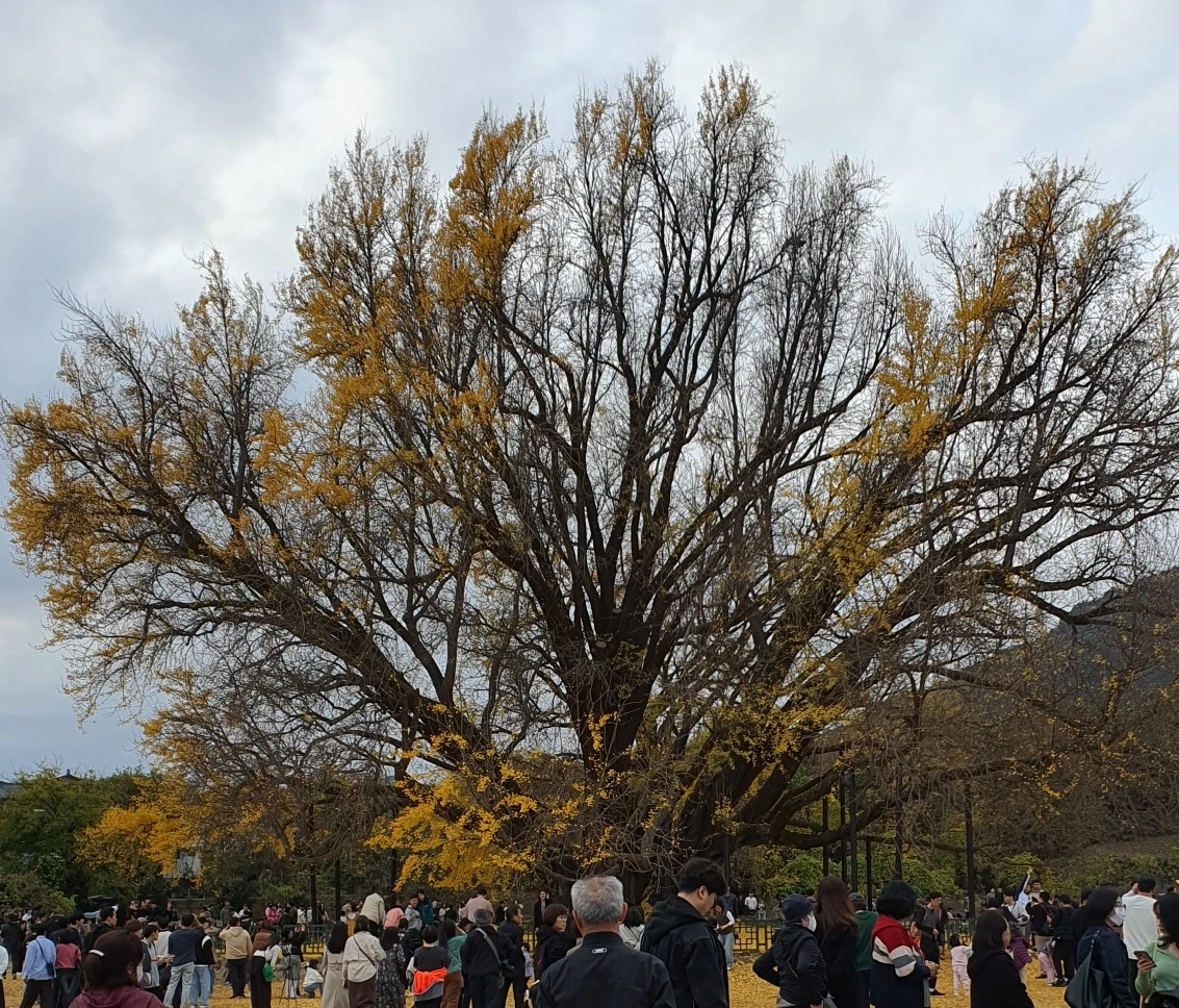 처음 나무를 찾아갈 즈음에 우리는 아주 편안하게 방문했다. 나들이객 없는 시골의 의 작은 마을 은행나무 앞에서 사진 찍고 떨어진 나무잎을 주워 허공에 뿌리며 아이처럼 놀아보기도 했다. 그러나 해마다 사람들이 조금씩 더 늘어나더니 3,4년 전부터는 좁은 마을길이 어수선해지기 시작했다. 오고 가는 사람들과 차량들로 좁은 도로가 엉키는 날이 많아졌다. 2,3년 전에는 나무 옆으로 화장실도 생기고 10 여대 주차 공간도 생겼지만 그 주차공간으로는 아무런 도움도 되지 못했다. 그래도 우리들은 사람 없는 평일의 아침 시간을 이용해 한가함을 즐길 수 있었다.