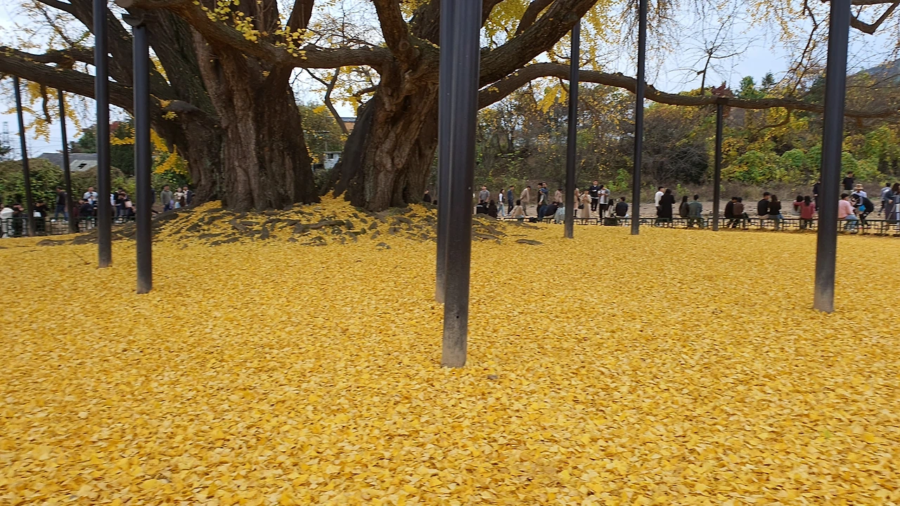 일주일 전에 방문했을 때는 연두가 섞인 노랑이었는데 어제의 은행나무는 노란 잎을 막 떨구고 있었다. 바람 부는 대로 우수수 단풍을 떨어뜨리는 나무를 보는데 "아, 예쁘다" 하는 소리가 옆에서 들리지만 눈물이 날 만큼 안쓰럽고 슬펐다. 거대한 은행나무도 계절의 흐름 앞에 은행잎을 떨어뜨릴 수밖에 없다.. 우리도 세월 앞에 어쩌지 못하고 굴복하는 삶을 살지 않는가