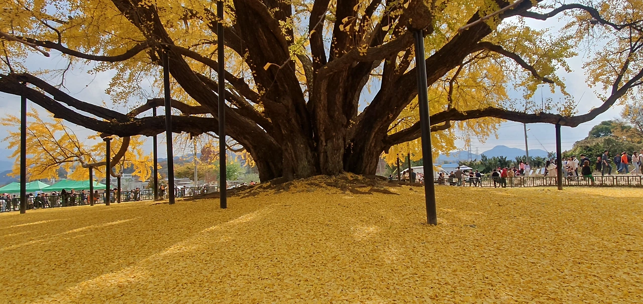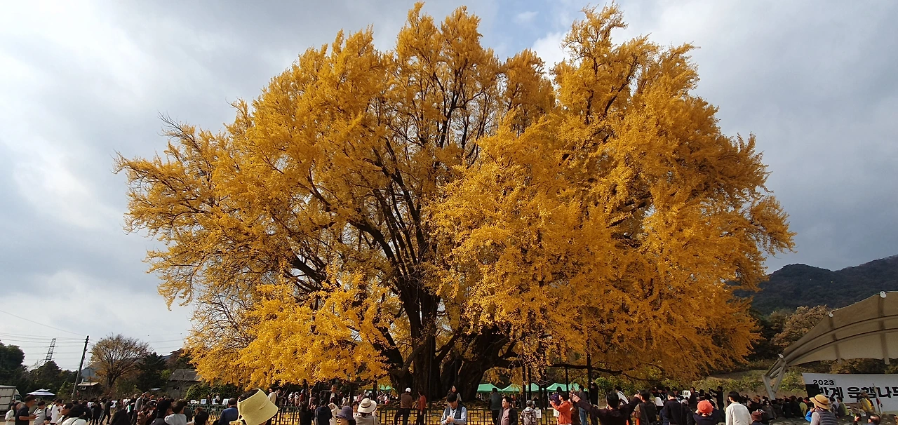 시골 마을에 있는 나무 한 그루. 달랑 한 그루라고 말할 수 없는 게 그 나무가 엄청 크다는 거다. 높이는 아파트 11층 높이인 34.5m이고 둘레는 16.9m 넓이가 31m라고 하는데 숫자만 가지고 그 위용을 상상하지 못한다. 초록의 여름이 지나 가을이 오면 은행나무가 노랗게 변해 간다. 가로수 은행나무보다는 며칠 늦게 단풍이 든다. 몇 년 동안 가을 단풍 든 나무를 찾아가다 보니 11월 초가 되면 나무가 완전히 노란 나무가 된다. 그 나뭇잎이 어느 해는 서서히 떨어지고 어느 해는 하룻밤 사이에 나뭇잎이 100% 몽땅 떨어지고 만다. 그 절정의 모습을 보기 위해 단풍철이 오면 우리들은 나무에 대한 정보를 교환하며 단풍이 가장 아름다울 날을 기다려 은행나무를 보러 간다.