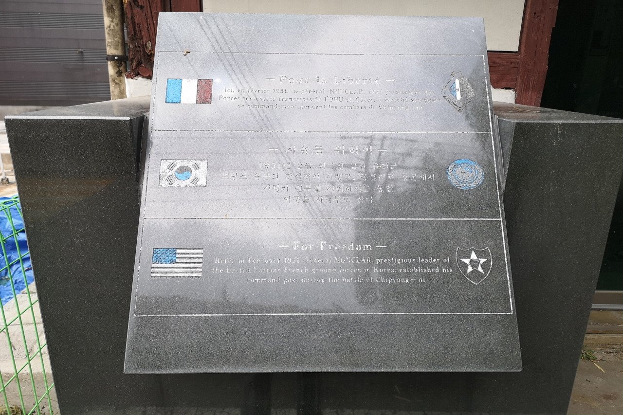 지평양조장 앞에는 대한민국 근대문화유산 표지판 옆에 다른 표지석이 서 있다. 이 표지석은 또 하나의 역사를 자랑하고 있는 듯 보인다. 6.25 전쟁 때 지평리 전투를 지휘하기 위해 이곳 양조장 건물을 유엔군 프랑스 육군 사령부로 사용한 역사적 사실을 기념한 표지석이다. 여기에는 프랑스어, 한국어, 영어로 다음과 같은 글귀를 새겨 두었다.