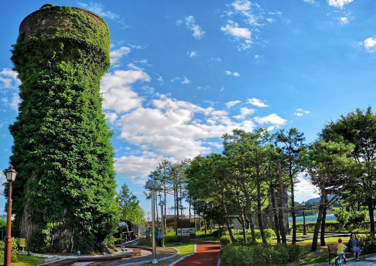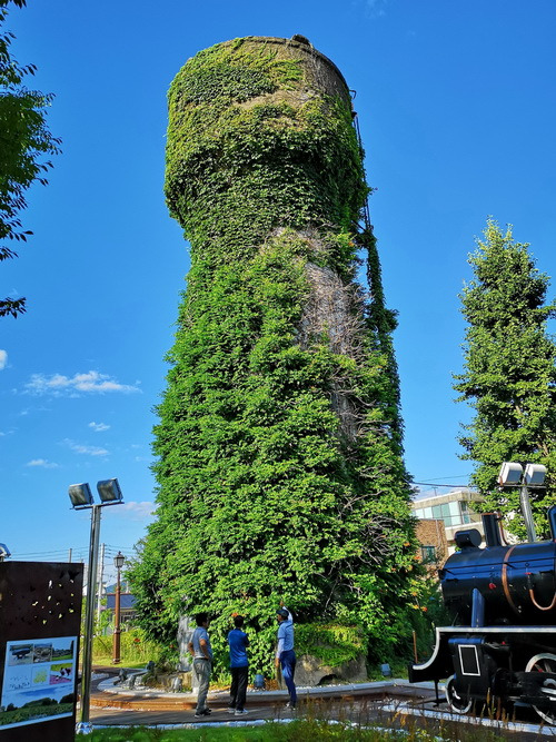 ▲ 연천역의 원통형 급수탑 등록문화재 제45호 근대문화유산으로 등록된 원통형 급수탑과 전시 중인 증기 기관차