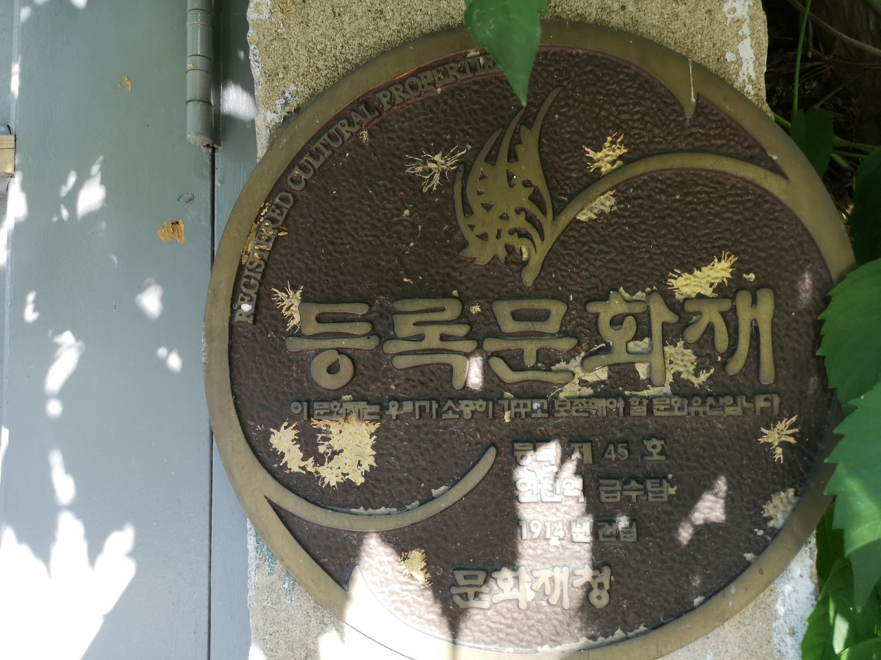 사람들이 드나들 수 있게 만든 출입문 옆에 '등록문화재' 동판이 붙어 있어 이 급수탑이 등록문화재임을 알려준다. 상자형 급수탑에는 동판이 붙여져 있지 않다. 여름에는 덩굴식물인 능소화가 원통형 급수탑을 뒤덮고 있어 원래의 재질과 모습을 보기가 어렵다.