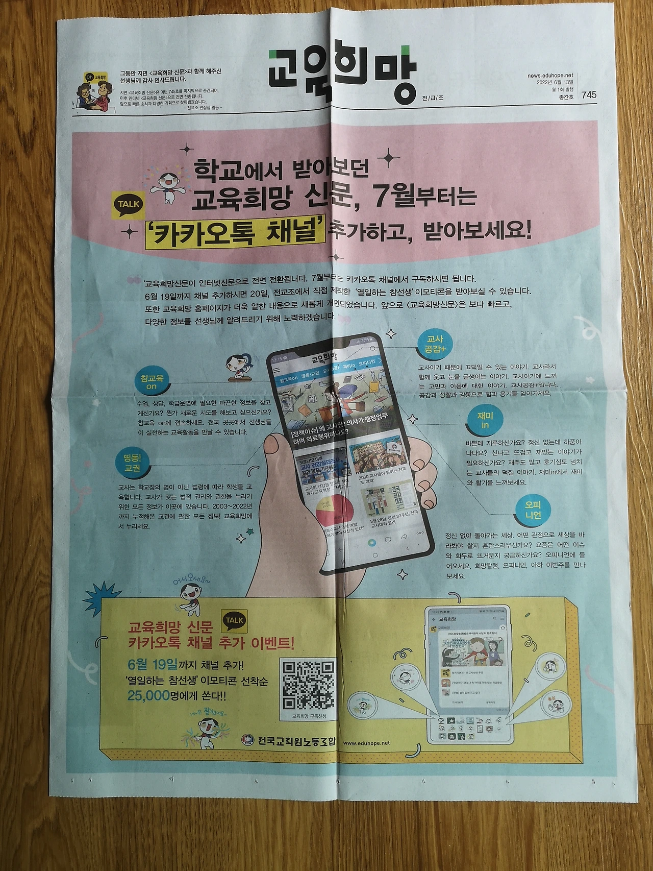 마지막 발행되었다는 '교육희망' 종이신문 한 장을 바라보며 참 많은 생각이 드는 아침을 맞았다. 퇴직 후에도 꼬박꼬박 배달되어 온 교육희망을 대수롭지 않게 받아 그 자리에서 훑어보고 분리수거함에 던져 넣었던 지난 몇 년이 미안해진다. 오늘 신문은 기사 하나하나 꼼꼼히 읽어 보아야겠다. 이 글을 쓰면서도 괜히 눈가가 촉촉해지는 것을 느낀다.