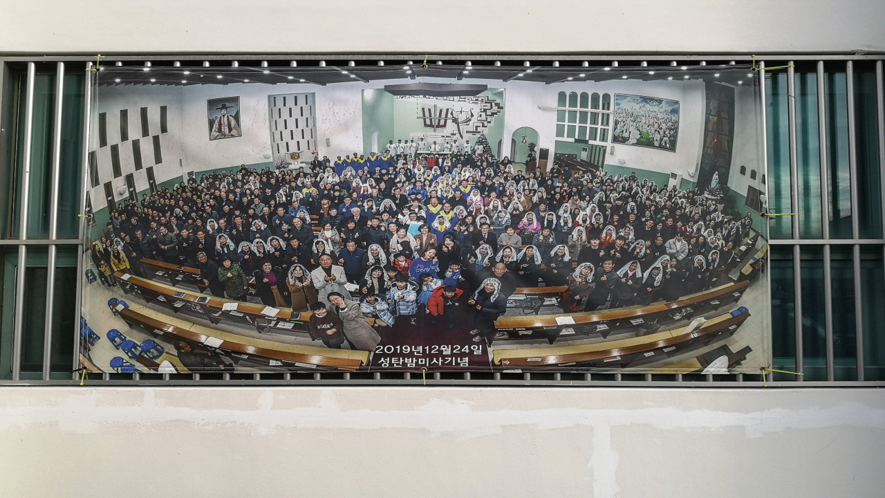 왜관성당 부속건물에 걸린 2019년 성탄밤 미사 기념 사진