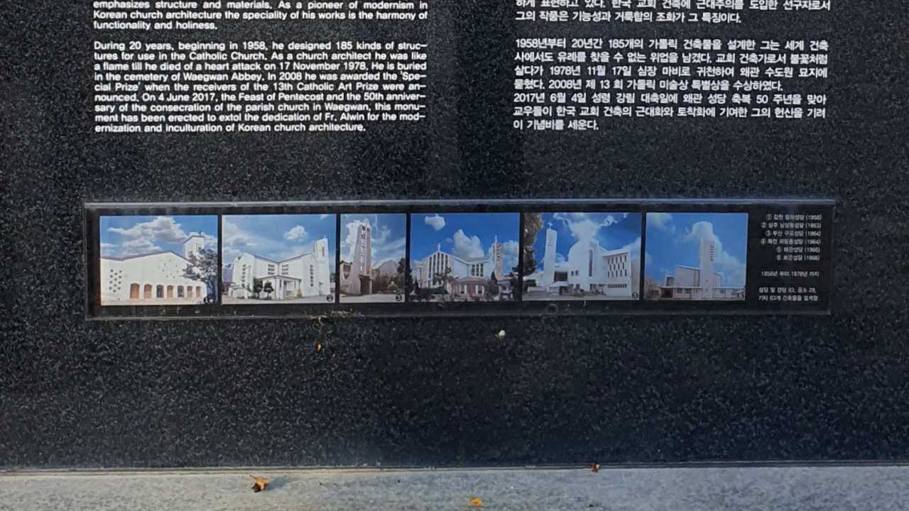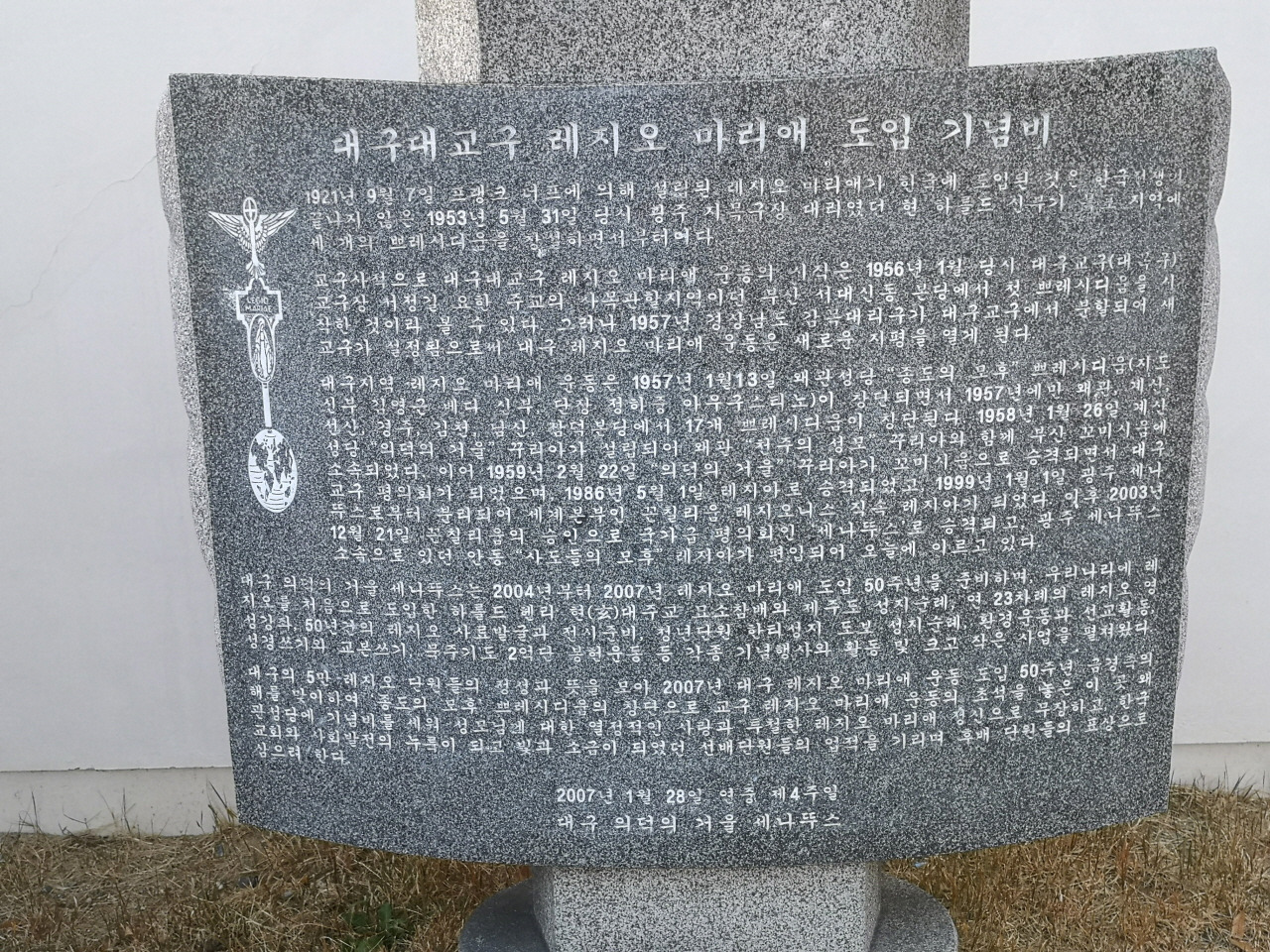 여간한 재능과 열정이 아니면 이룰 수 없는 업적일 것이다. 더군다나 알빈 신부의 업적이 대부분 한국에서 이루어진 사실도 고마웠다. 전쟁으로 피폐해진 이 땅에 과거의 인연을 끈 삼아 찾아온 한 외국인 신부의 노력으로 한국의 근현대 가톨릭 건축물의 토대가 이루어진 것은 작은 일이 아니다. 이날 왜관성당 방문을 통해 알빈 신부를 알게 된 우연이 다행스럽게 여겨지는 순간이었다. 비문이 끝난 비석의 아래쪽에는 그가 설계한 대표적인 성당인 김천 평화성당(1958), 상주 남성동성당(1963), 부산 구포성당(1964), 제천 의림동성당(1964), 왜관성당(1966), 보은성당(1966)의 사진과 함께 한국의 성당과 경당 93, 공소 29, 기타 63개 건축물을 설계했다는 내용이 있다. 대구대교구 레지오 마리애 도입 기념비 알빈 신부 기념비 옆에는 또 하나의 비석이 있었다. '대구 레지오 마리애 50주년 기념비'라 되어있었다. 레지오 마리애(라틴어: Legio Mariae)는 통칭 레지오라고도 한다. 한국 레지오 마리애 운동은 1953년 목포 지역에서 시작된 가톨릭 교회의 평신도 신앙 공동체 운동이다. 사회봉사와 가톨릭 활동을 전개하는 가톨릭 단체이다. 대구대교구 레지오 마리애 운동은 1956년 부산에서 시작하였다가 1957년 경상남도 감목대리구가 대구교구에서 분할되면서 새 지평을 열었다고 한다. 대구지역 레지오 마리애 운동이 1957년 1월 13일 왜관성당 쁘레시디움(레지오 마리애 조직 중 가장 작고 기초적인 단위체)이 창단된 후 왜관, 계산, 선산, 경주, 김천, 남산, 삼덕본당으로 확산되면서 지금까지 발전하여 온 것을 기념하여 2007년 대구 레지오 마리애 운동 도입 50주년을 기념하여 단원들의 정성으로 세운 기념비였다. 왜관이 경상북도 지역의 가톨릭의 본거지라 일컬어지는 이유를 알 수 있을 것 같았다.