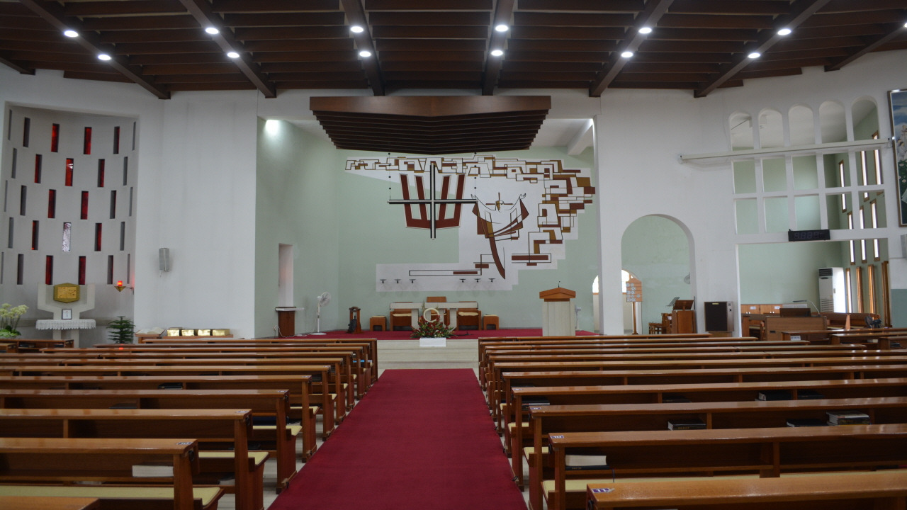 성당 마당에서 성당과 주변 시설물 등을 살펴본 후 내부를 보기 위해 서둘러 발걸음을 옮겼다. 현대식 외관과 함께 다른 성당에 비해 독특한 구조로 이루어졌다는 예배당 내부를 보고 싶었기 때문이다. 가톨릭 성당이나 개신교 교회를 방문하면 늘 예배당으로 들어가는 문이 열려 내부도 보면서 잠깐 기도를 드리고 나왔다. 그러나 이날 코로나 때문에 문이 굳게 잠겨 있었다. 이날은 내부를 보지 못해 성당 내부에 관한 내용은 문화재청의 자료 사진과 왜관성당의 홈페이지에 기재된 성당 설명을 참고로 하여 쓸 수밖에 없었다. 성당 내부는 타원형의 평면 공간에 제단부와 현관부를 덧붙인 형태이다. 전통적인 교회 건축의 내부 구조는 제단에서 출입문까지 긴 중앙 통로를 중심으로 직사각형으로 이루어져 있다. 왜관성당은 이 틀을 깨고 회중석을 가로로 더 넓게 지었다. 이것은 전례 기능에 따른 공간 배열을 최우선시한 것이다.
