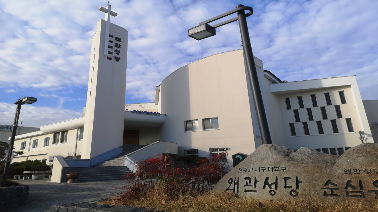 이 땅에 세워진 초기의 가톨릭 성당들이나 이후의 성당들이 대체로 이런 전통적 양식을 이어받았으나 왜관성당은 지어진 위치도 대로변에 세워져 가톨릭 성당으로서는 다소 이색적인 모습이었다. 겉모습으로 보았을 때 불과 몇 년 전 콘크리트로 지어진 현대식 건물 같았다. 웅장하고 권위적인 성당이라기보다는 이웃 동네의 교회처럼 교인들이 쉽게 다가갈 수 있는 분위기가 한결 정겨웠다. 차를 타고 지나가면 보이는 친근한 건물이기도 하였다. 왜관성당은 1928년 가실본당에서 분리되어 본당으로 승격하였다. 멀지 않은 거리에 있는 지금의 성 베네딕도회 왜관 수도원(왜관읍 관문로 61) 자리에서 1956년 말까지 구미와 성주, 군위지역까지 선교를 담당한 90여 년의 역사를 가진 유서깊은 성당이다. 선교활동뿐만 아니라 왜관 지역에 유치원과 학교를 설립하여 이곳의 교육여건 조성에도 힘을 기울여 왜관의 어린이와 청소년 교육에 큰 이바지를 하였다. 1967년 현재 장소(왜관읍 관문로 25)에 지금의 성전을 봉헌하였으며 왜관 지역 선교활동의 중심적 역할을 해왔다. 왜관성당은 성 베네딕도회 왜관 수도회 소속이었던 독일인 알빈 슈미트(Alwin Schmid, 1927~1978) 신부가 설계하여 1966년 건축하였다. 당시 대부분의 성당이 전통적인 양식주의 형태로 지어진 것과 달리 왜관성당은 근대적인 모습을 띠고 있다. 철근콘크리트 구조의 2층 건물로 그 당시로는 드물게 2층에 성당을 두었다. 그래서 고딕식이나 로마네스크 양식의 가톨릭 성당 모습에 익숙하였던 눈에 이런 근대적 모습의 성당을 처음 보았을 때 낯선 모습으로 다가왔던가 보다.