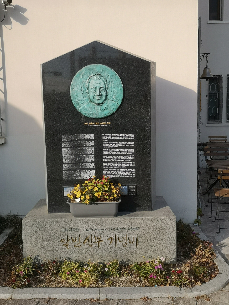 2층 예배당으로 들어가기 위해서는 마당에서 계단을 올라가야 한다. 그 계단 옆에 한 인물의 부조상이 새겨져 있는 비석이 눈에 띄었다. 그 비석 아래쪽에 큰 글씨로 '알빈 신부 기념비'라고 새겨져 있었다. 그 비석 비문 위쪽에는 알빈 신부의 부조상과 함께 '교회 건축가 알빈 슈미트 신부'라고 새겨져 있었다. 알빈 신부가 어떤 분일까 하는 궁금증이 생겨 비문의 내용을 찬찬히 읽어보면서 한 외국인 신부님에 관한 놀라운 사실을 알게 되었다.
