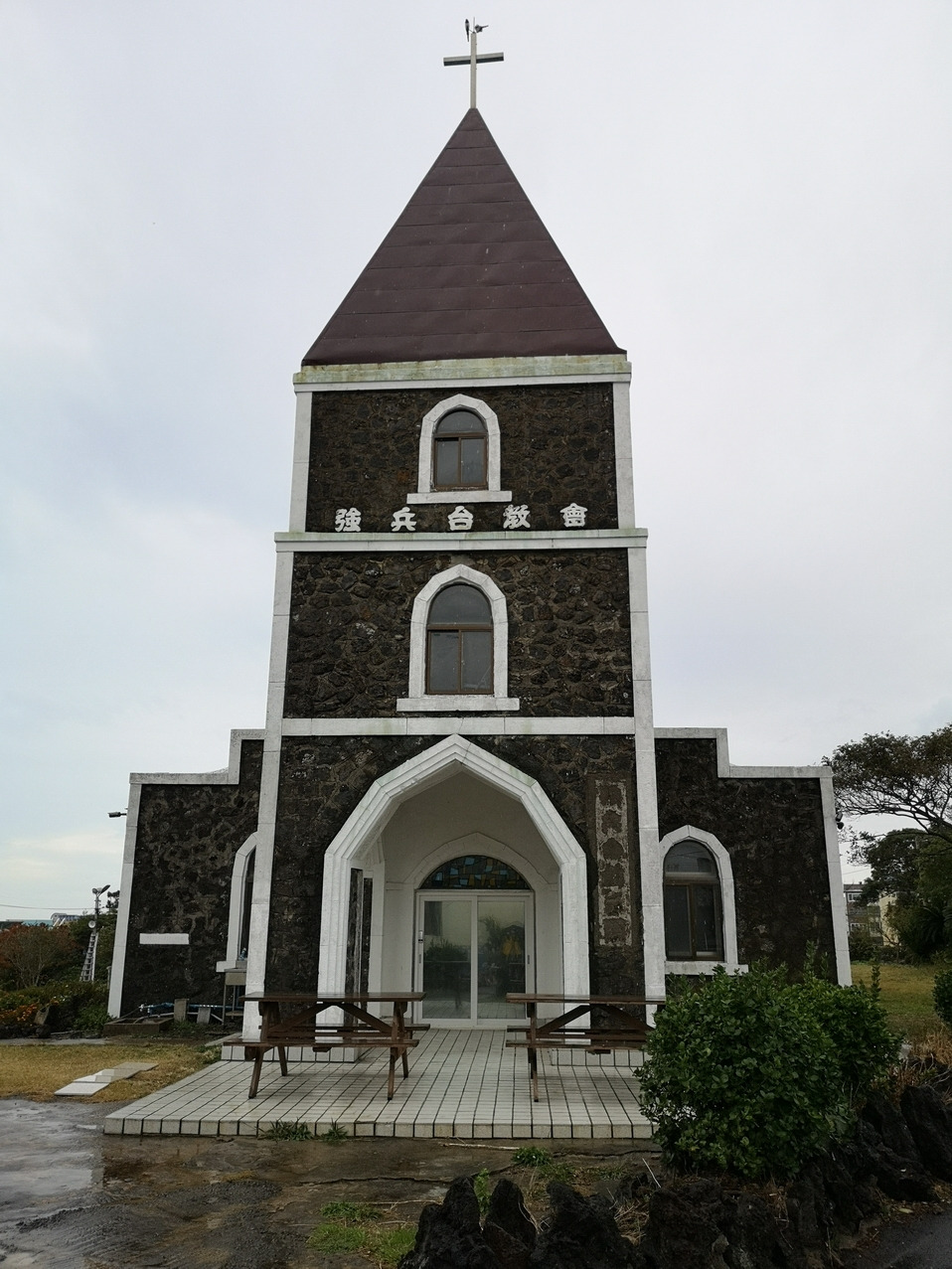 교회 건물을 보는 순간 ‘참 단단하게 지어진 강인한 건물’이라는 생각이 먼저 들었다. 아마도 제주도의 단단하고 검은 현무암으로 쌓아서 그런가 보다. 단순한 형태로 견고하게 지어진 군대 건축의 특징이 잘 나타나 그런 느낌이 먼저 다가온 것 같다. 한국 전쟁 당시 육지와 멀리 떨어진 제주에서 인적•물적 자원이 부족한 가운데 지어진 당시의 상활을 보여준다. 민간 기술자의 지원 없이 군 공병대의 기술로만 만들어졌다.