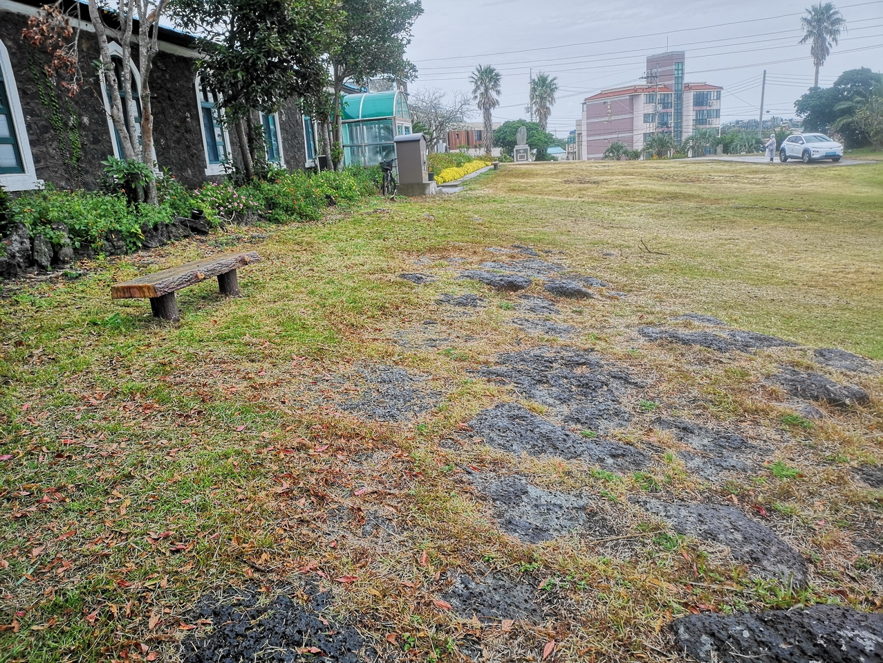남제주 강병대 교회 옆의 잔디밭. 중간 중간에 제주도의 화산석인 현무암이 박혀 있다.