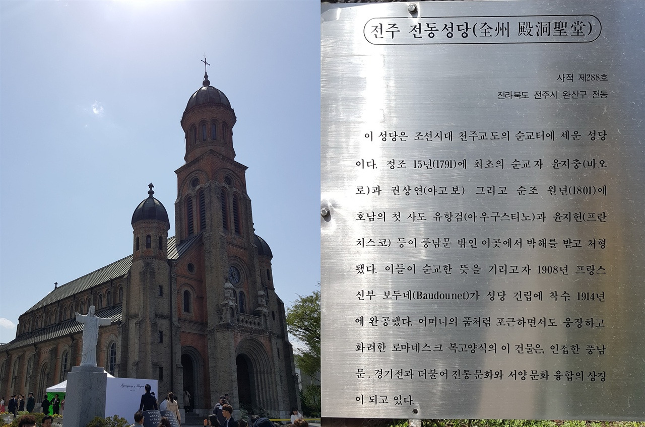 전주 전동성당과 윤지충, 권상연 등이 순교한 형장이었음을 알리는 표지판
