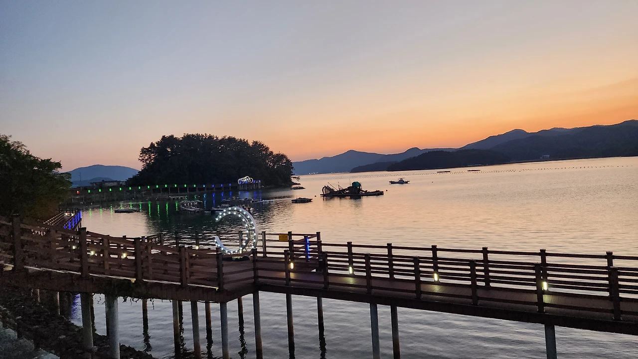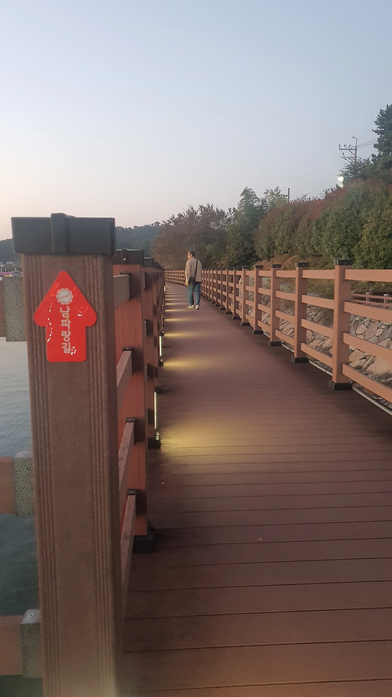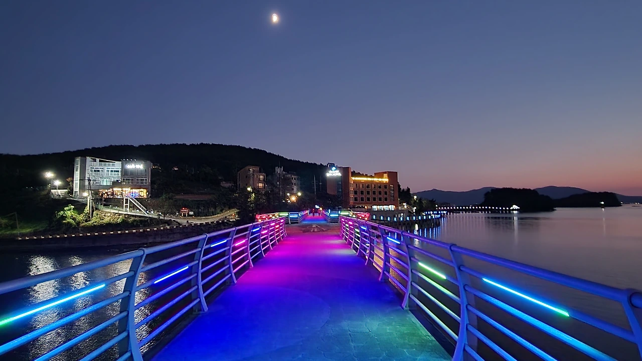 잠시 후 나무 산책길에 설치된 오색 등이 깜박이며 밤바다를 수놓기 시작했다. 얼른 씻고 바다로 나가 산책길을 걸으며 사진을 찍으며 아내와 함께 밤의 바다 풍경을 즐겼다.