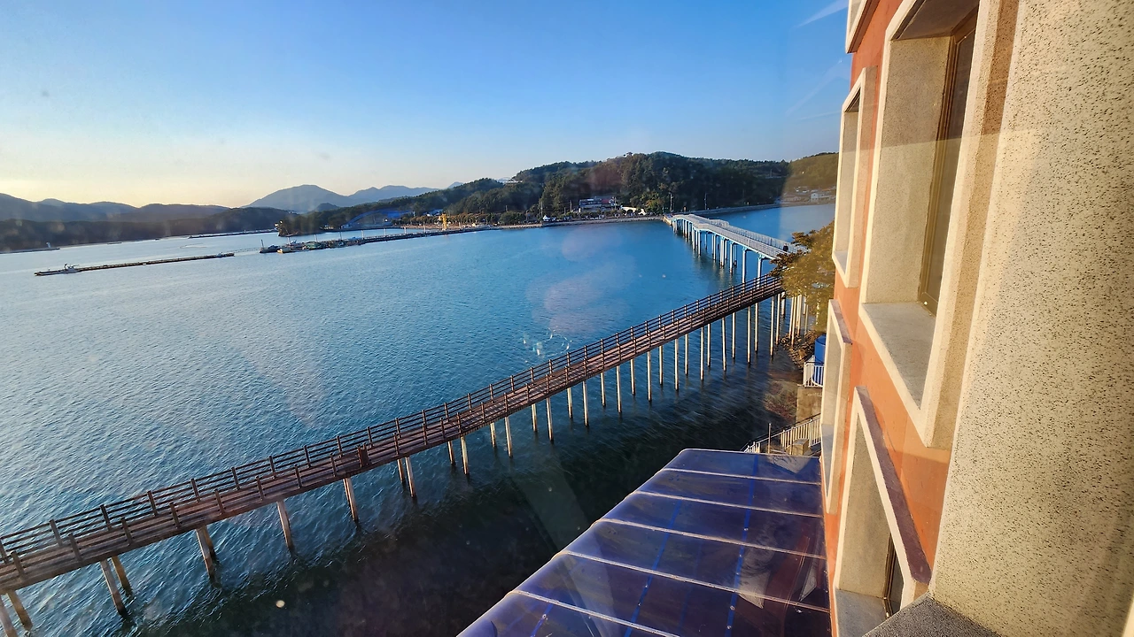 호텔방에서 창을 통해 보는 바다 풍경이 시원스럽다. 3층에서 바다 아래쪽을 보면 나무로 만들어진 산책길이 바다 건너편 해안까지 다리로 이어지고 있었다.