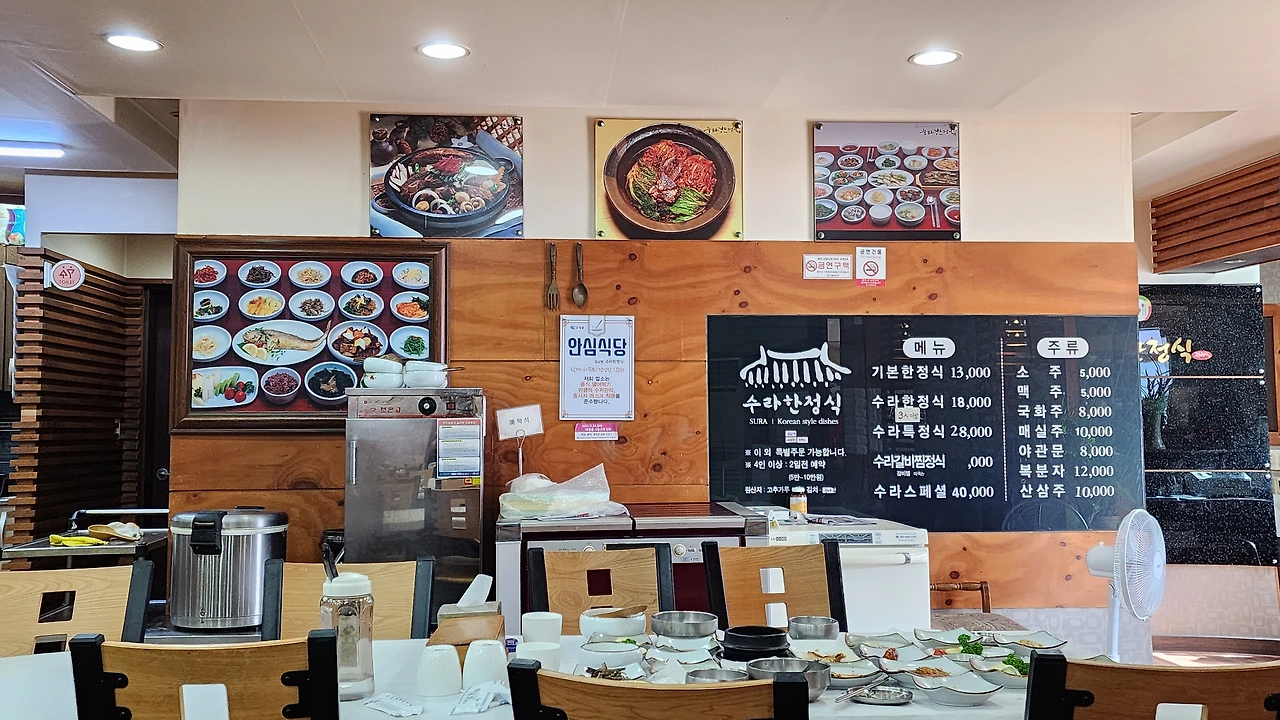 송학동 고분군과 박물관 관람을 마친 후 인근에 있는 '수라한정식'에 갔다. 앉을자리가 있기는 했으나 손님들이 많아 음식을 먹기도 전에 맛집임을 직감할 수 있었다. 우리 뒷자리에는 꽤 나이 드신 어르신들이 단체와 와서 그중에서 제일 연로하신 한 분의 생일 축하하는데 '생일 축하합니다~~'가 아닌 'Happy birthday to you~~'를 부르시는 모습을 보고 아내가 이채롭다며 재미있어했다.