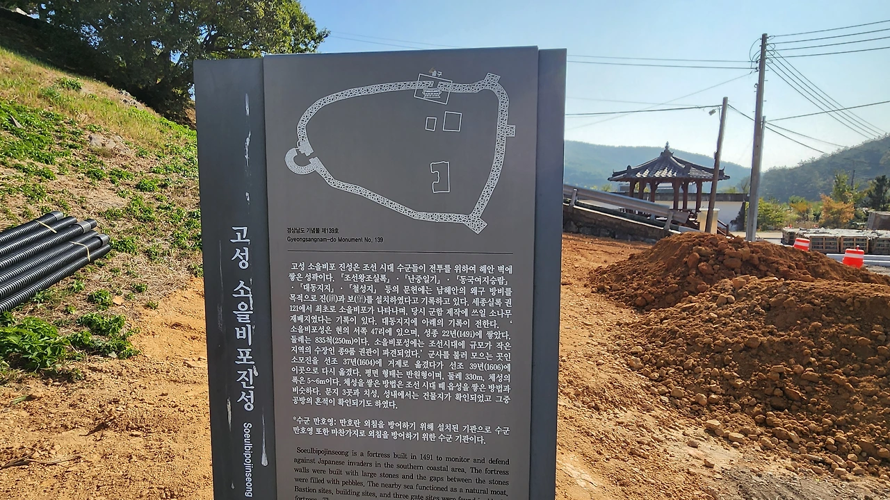 고성에서의 마지막날 아침, 상족암 건너편의 병풍바위 전망대에 산책을 다녀와 짐을 챙겨 고성읍으로 나왔다. 나오는 길에 소을비포에 있는 조선시대의 성터인 소을비포진성 탐방으로 고성군이 지원하는 1주일 여행을 마무리하였다.