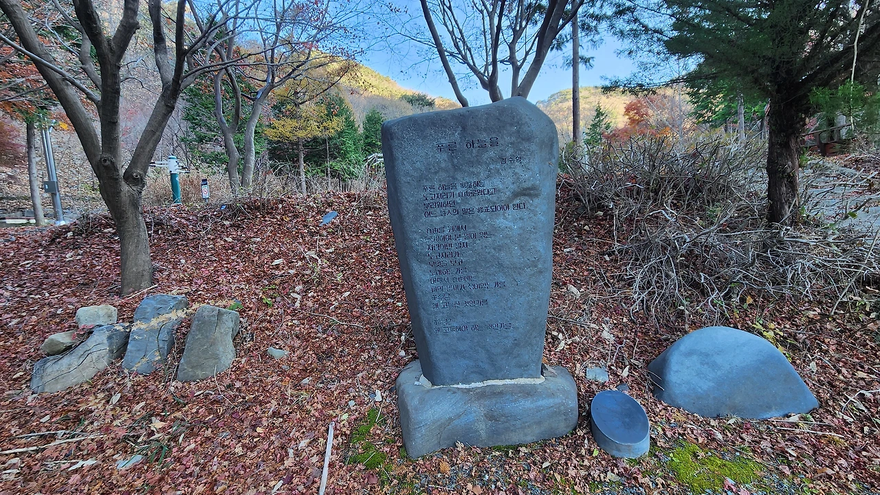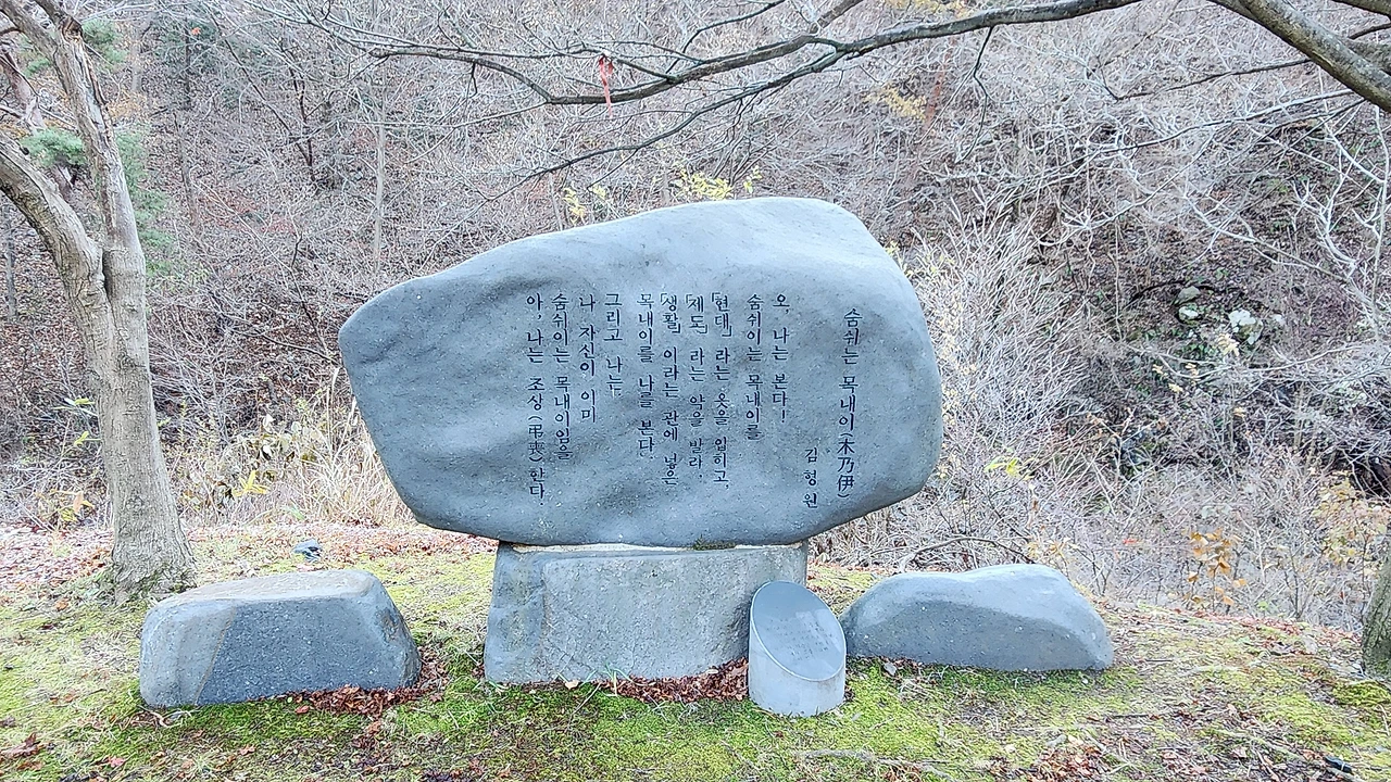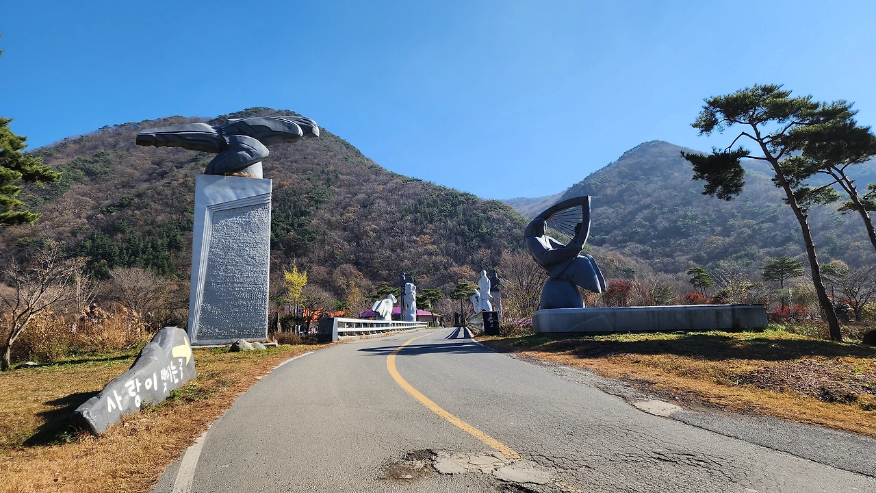 이틀간 머물렀던 성주산자연휴양림의 편백나무 숲으로 오르는 길 양옆으로 우리나라 시인들의 시비들이 줄지어 서있었는데, 이곳 개화예술공원에도 거대한 동물 조각들과 시와 명언을 새긴 비석이 늘어서 색다른 풍경을 보이고 있다.