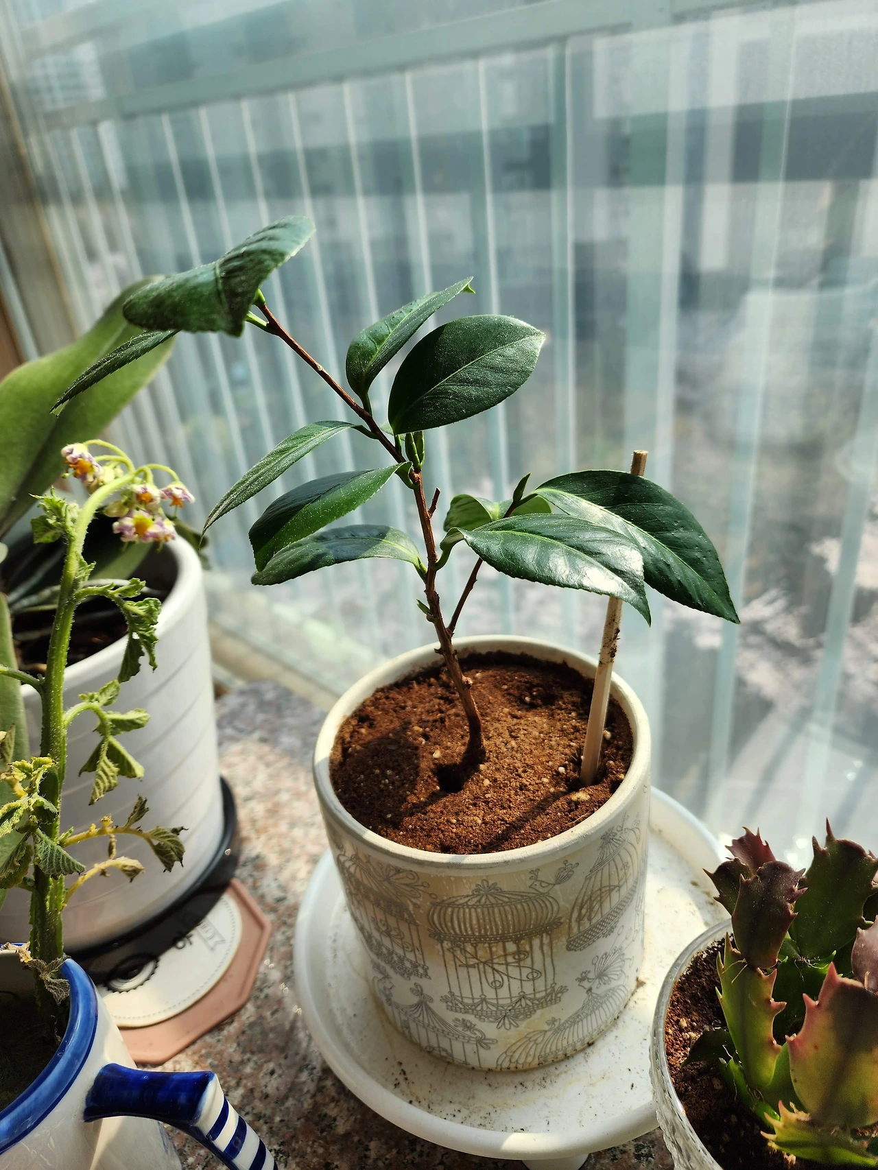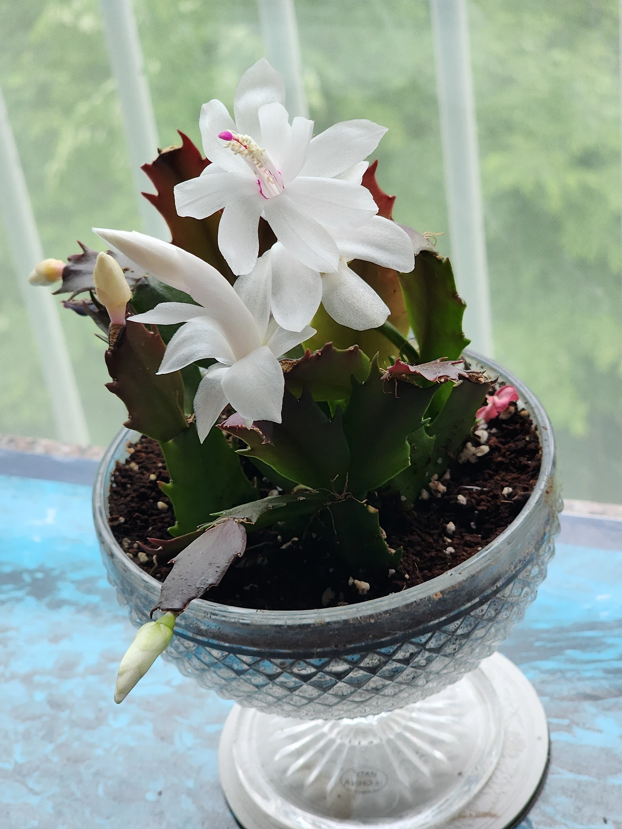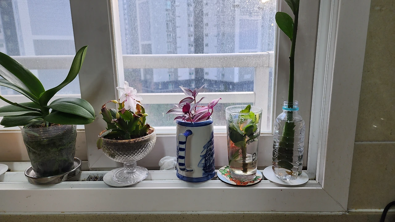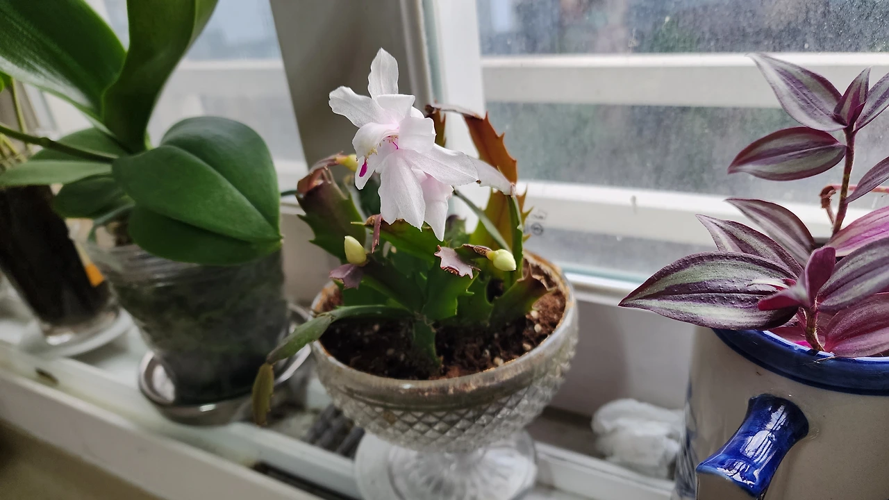 게발 닮은 줄기 때문에 억울한 꽃 | 작년에 삼육대 에코팜 식물 테라피 강습에서 꽃망울만 있는 아주 작은 게발선인장을 선물로 받았다. 아내는 배운 대로 물을 채운 유리잔 속에 넣어 수경 재배