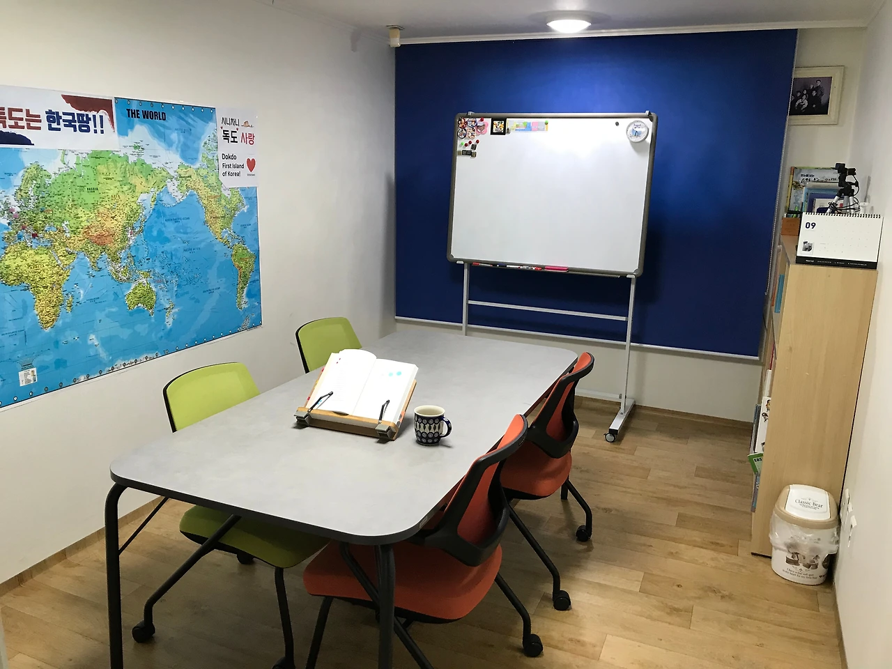 현관 앞에 작은 방이 있다. 우리 집 도서관이고 공부방인 집현전(集賢殿)이다. 넓은 회의용 테이블과 4개의 의자가 있다. 이동이 가능한 화이트보드도 설치했다. 한쪽 벽 책장에는 아이들 책이 가지런하다. 맞은편 벽에는 한반도와 세계지도가 있다. 책을 읽다가 지도에서 바로 찾을 수 있다. 창문에는 커튼을 대신해 유튜브 크로마키 용도로 파란색 롤 스크린을 설치했다. 뉴스 스튜디오처럼 파란색은 신뢰감과 정서적 안정감을 준다.