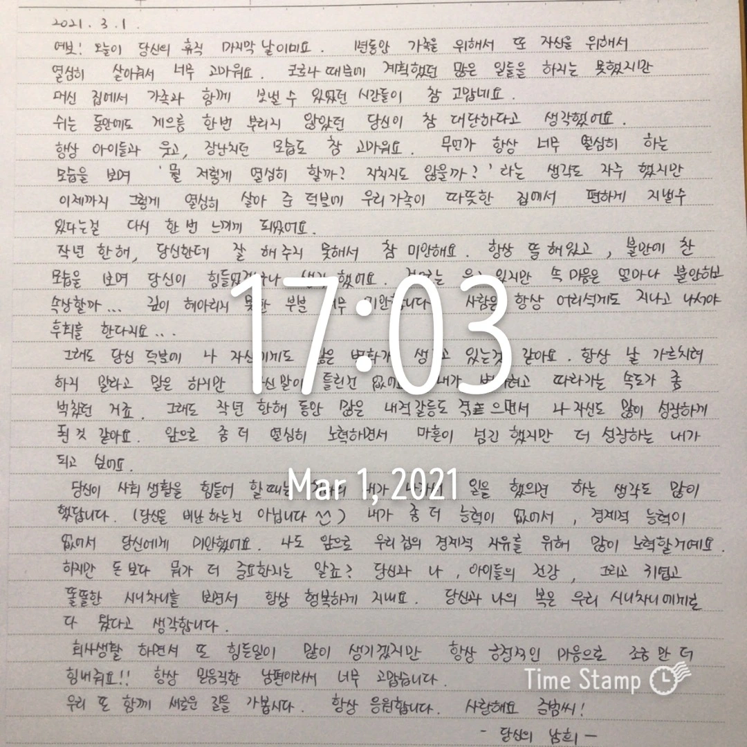 "여보 오늘이 당신 휴직 마지막 날이에요. 1년간 가족을 위해 또 자신을 위해서 열심히 살아줘서 너무 고마워요. 쉬는 동안에도 게으름 한번 부리지 않았던 당신이 참 대단하다고 생각했어요. 항상 아이들과 웃고, 장난치던 모습도 참 고맙고요. 무언가 항상 열심히 하는 모습을 모며 '뭘 저렇게 열심히 할까? 지치지도 않을까?'라는 생각도 자주 했지만 그렇게 열심히 살아준 덕분에 우리 가족이 따뜻한 집에서 편하게 지낼 수 있다는 걸 다시 한번 느끼게 되었어요."