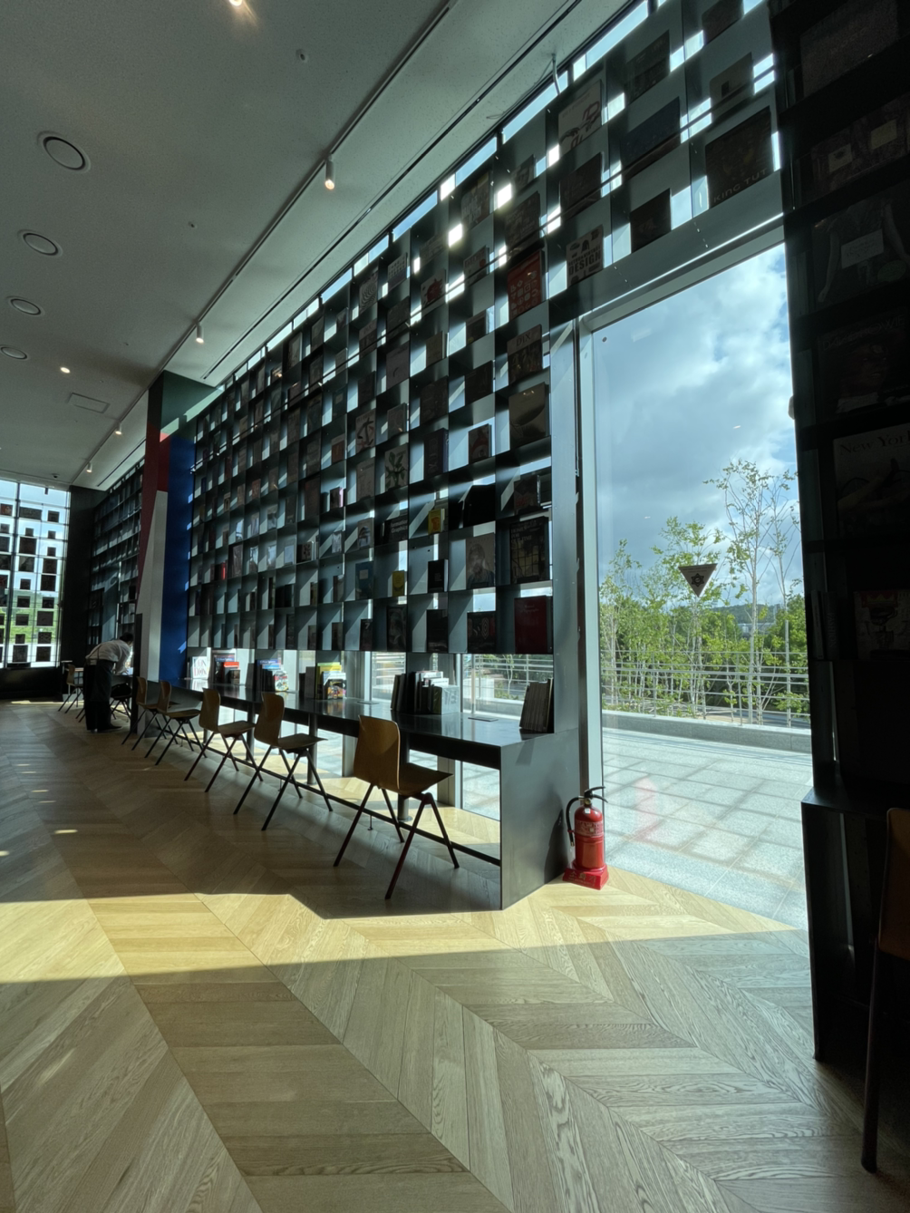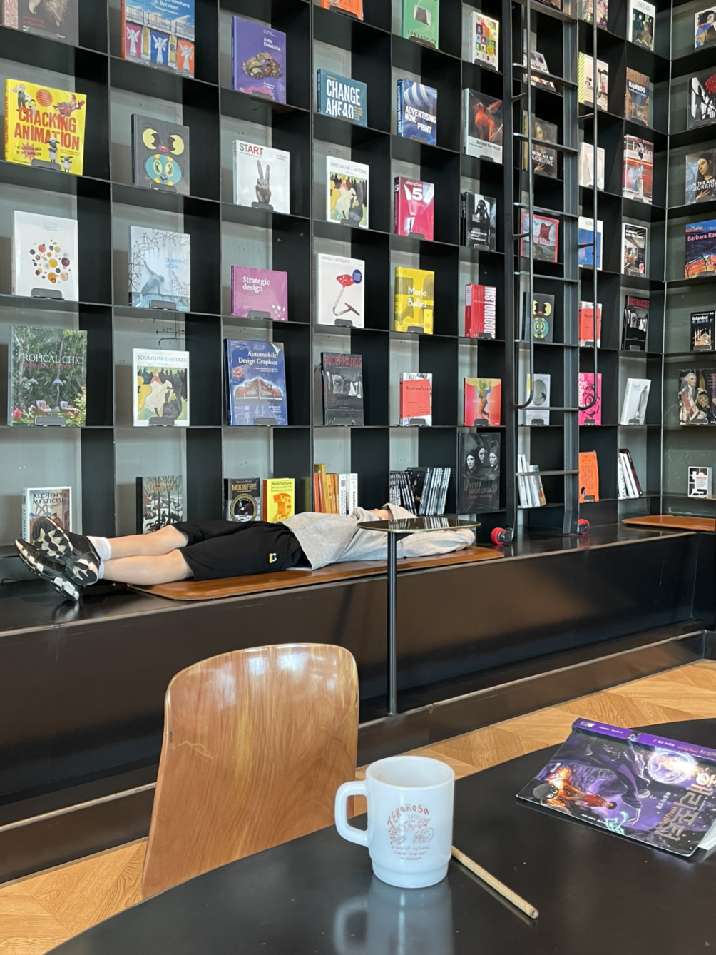 단단하지만 차가운 철로 만들어진 널따란 테이블과 책장 인테리어에