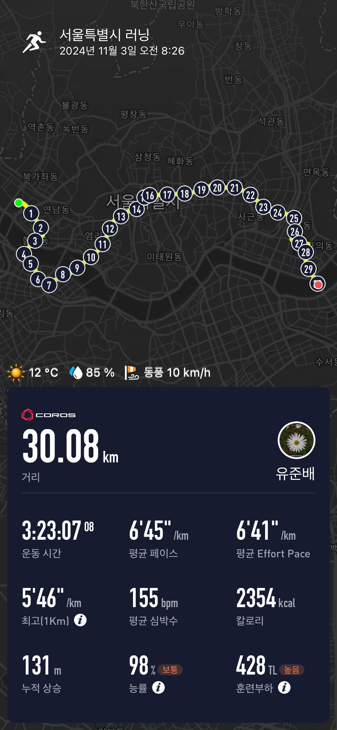 그렇게 쌓은 거리와 시간들 속에서 한 번은 30km를 넘게 달려보기도 했다. 부족한 훈련이었지만, 그래도 5개월 동안 월 120~150km 정도를 꾸준히 채웠으니 풀코스 완주는 할 수 있겠지. 그런 어설픈 자신감을 품은 채, 나는 어느새 11월을 맞이했다.