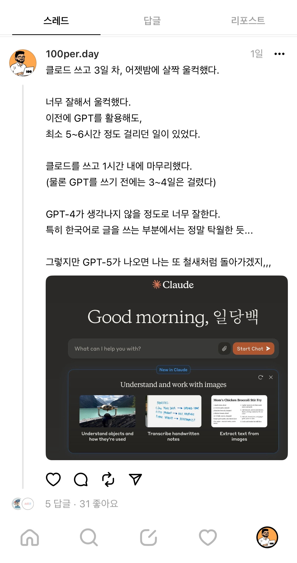 클로드는 저와 같이 결과물이 '한글'로 나와야 하는 경우에 정말 도움이 많이 됐어요.