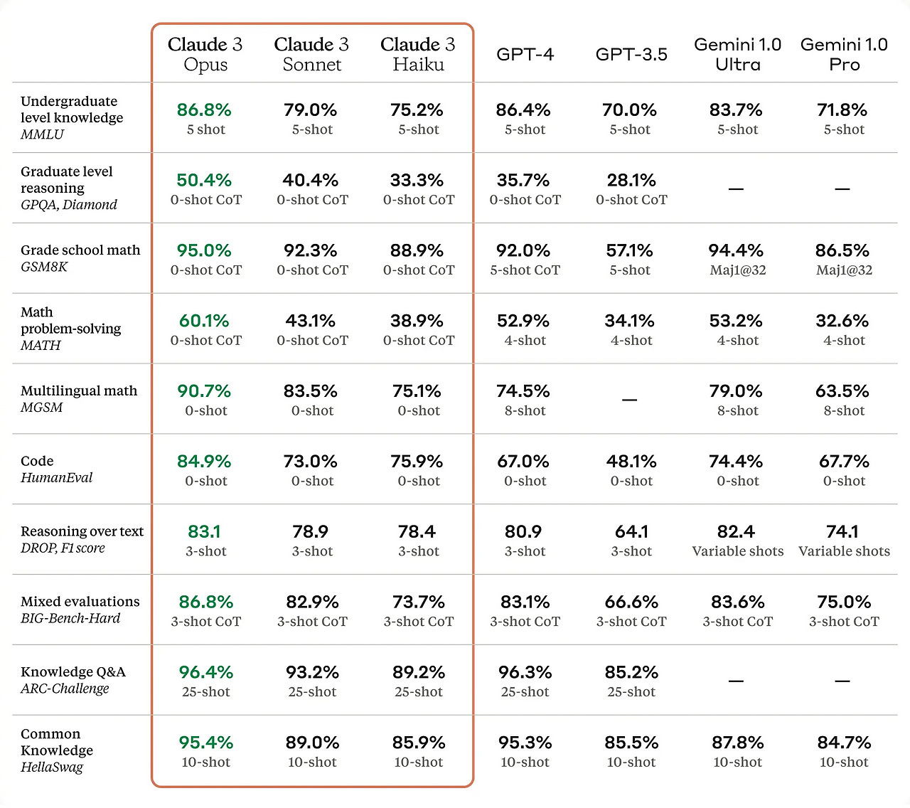 Anthropic의 Claude 3 모델과 OpenAI의 GPT 모델의 다양한 벤치마크 테스트 결과를 살펴보았습니다.