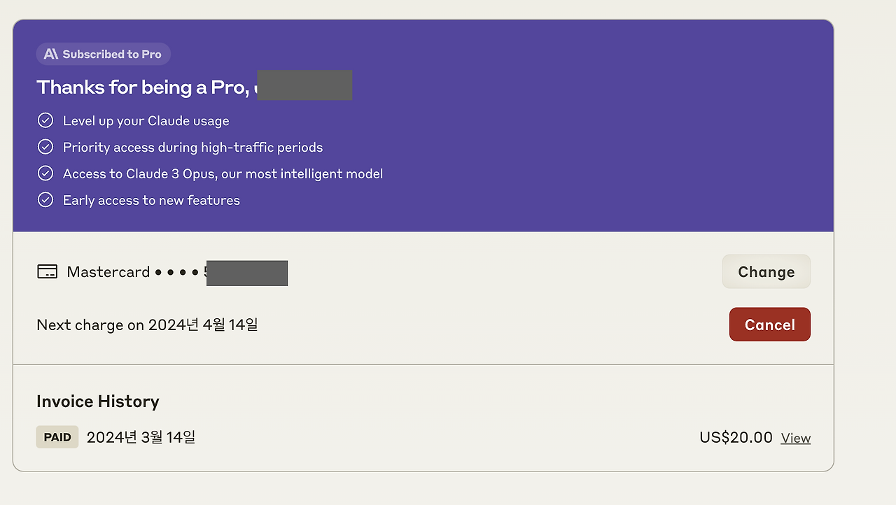 클로드 3의 유료 모델인 오퍼스(Opus)를 쓰기 위해서 바로 결제를 했습니다.