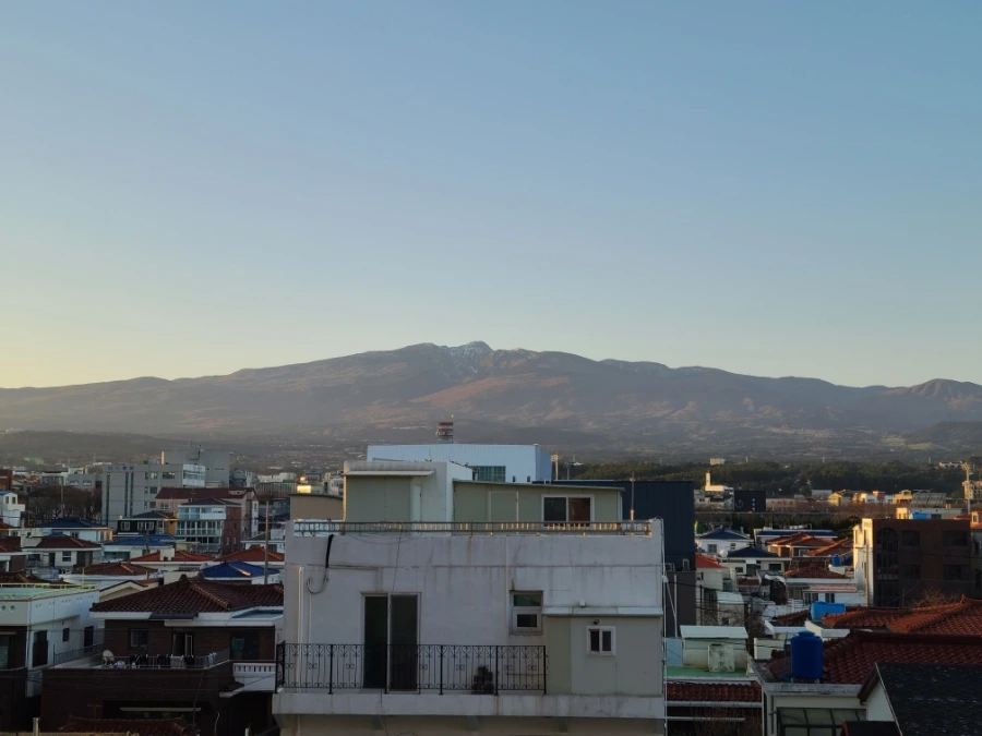 조금 쌀쌀한 아침, 합숙소 창문으로 보이는 한라산이 맑은 햇빛을 받으며 우뚝 서있었다. 씻고, 간단하게 아침을 먹고 출발하기 전 사진을 하나 찍어보았다.