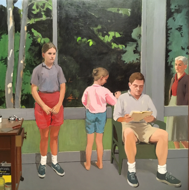 사실주의적 화가인 포터의 스크린 포치는 여름휴가 동안 지낸 메인 주의 작업실에서 작업한 색다른 가족 초상화이다. 그의 두 딸과 그와 공개적으로 사귄 James Schuyler라는 저명한 영국 시인, 그리고 전체적으로는 전경에서 바라본 작가의 관점인 반면 포터의 아내인 Anna가 창문 바깥에서 안쪽을 바라보고 있어, (실제로 넷이 같이 살았기 때문에) 가정에서의 긴장을 한 화폭에 담아내었다.