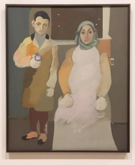 이 그림은 지난번에 처음 만난 미술 애호가 빌이 침을 튀기며 설명하면서 내게 보여주고 싶었던 고르키의 작품 중 하나로서 어머니와 자신의 초상을 남긴 것인데, 실제로 보면 여자 옷의 밝은 부분은 연한 분홍색으로 매우 아름다웠다. 채도가 낮은 오묘한 색상들의 조합은 스산하고 처연하면서도 두 사람의 커다랗고 퀭한 눈 그 고요하고 침착함 속에서 절규하는 슬픔을 느낄 수 있었다. 다채로운 코트의 신비로움이 남아있으면서도 거친 붓터치가 남겨놓은 키네틱 에너지는 정동감의 대조를 이룬다. 그리운 어머니의 손 부분, 최소화한(minimal) 배경 등 여러 번 그리고 덧칠하여 지우고 고심한 흔적이 역력하다. (작화 실력이 있음에도) 결국 두 손을 뭉뚱그리는 결정을 한 것은 어머니의 죽음에 대한 무력감의 표현일지도 모른다.