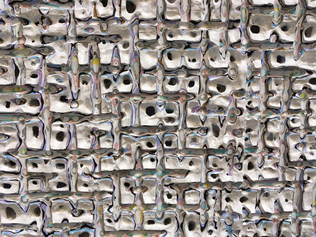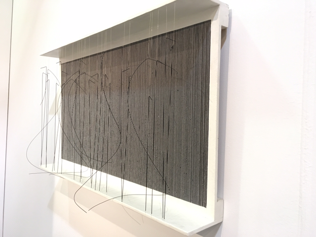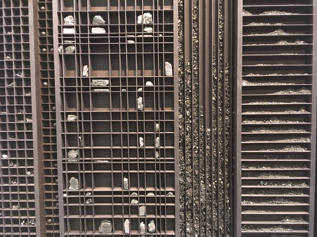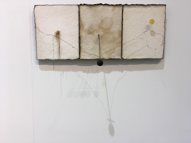 Pier Paolo Calzolari, b. 1943, Untitled, 1989-2016, Salt, lead, iron, copper, mother-of-perarl, burned wood, cotton thread; triptych, 31x68.7x17.5cm.