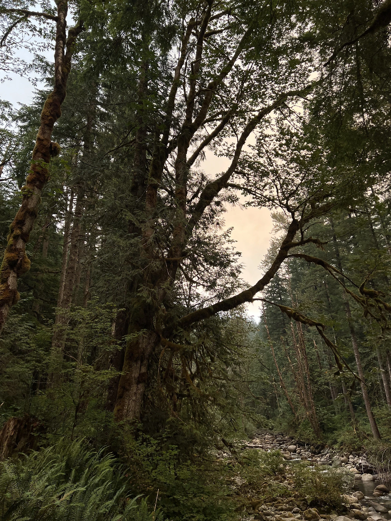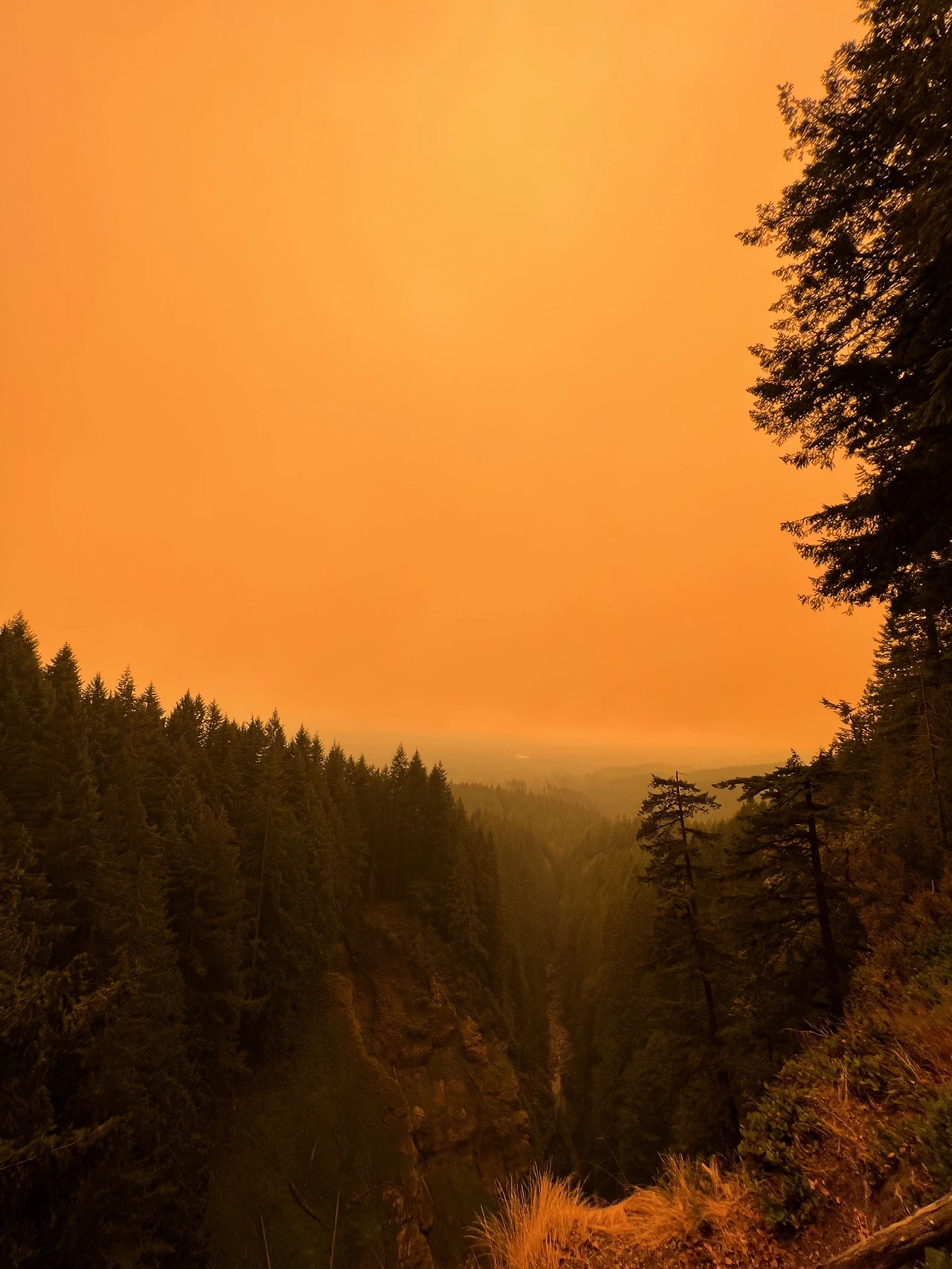 오늘의 하이킹 장소는 Wallace Falls 트레일로, Wallace 폭포는 Lower Wallace Falls, Middle Wallace Falls, Upper Wallace Falls - 아래 폭포, 중간 폭포, 윗 폭포 - 세 개의 폭포로 이어진 긴 폭포를 보러 가는 하이킹 코스이다. 트레일의 주차장에 도착했을 때 이미 꽤 많은 차가 있었고, 우리는 의심 없이 하이킹을 시작했다. 트레일의 초반만 하더라도, 주위가 좀 어둡고, 하늘이 살짝 붉은 느낌은 있었지만, 크게 이상한 점을 느끼지는 못했다. 주변에서 무슨 일이 생기고 있는지 모르는 채 우리는 계속 위로 위로 위로 열심히 걸음을 옮겼다. 일순간 온 세상이 어두워지더니 하늘이 불타오르는 것처럼 오렌지 빛으로 변하기 시작했다.