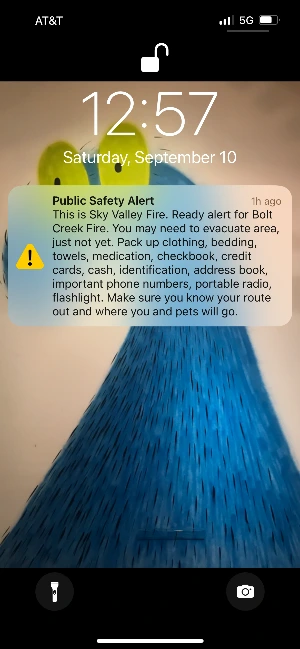 이곳은 스카이 밸리 화재 지역입니다. 볼트 크릭 화재에 대한 준비 경고입니다. 지금 당장은 아니지만, 대피해야 할 수도 있습니다. 의류, 침구, 수건, 약, 수표, 신용카드, 현금, 신분증, 주소록, 중요한 전화번호, 휴대용 라디오, 손전등 등을 챙기세요. 대피 경로와 반려동물을 어디로 데려갈지 확인하세요.