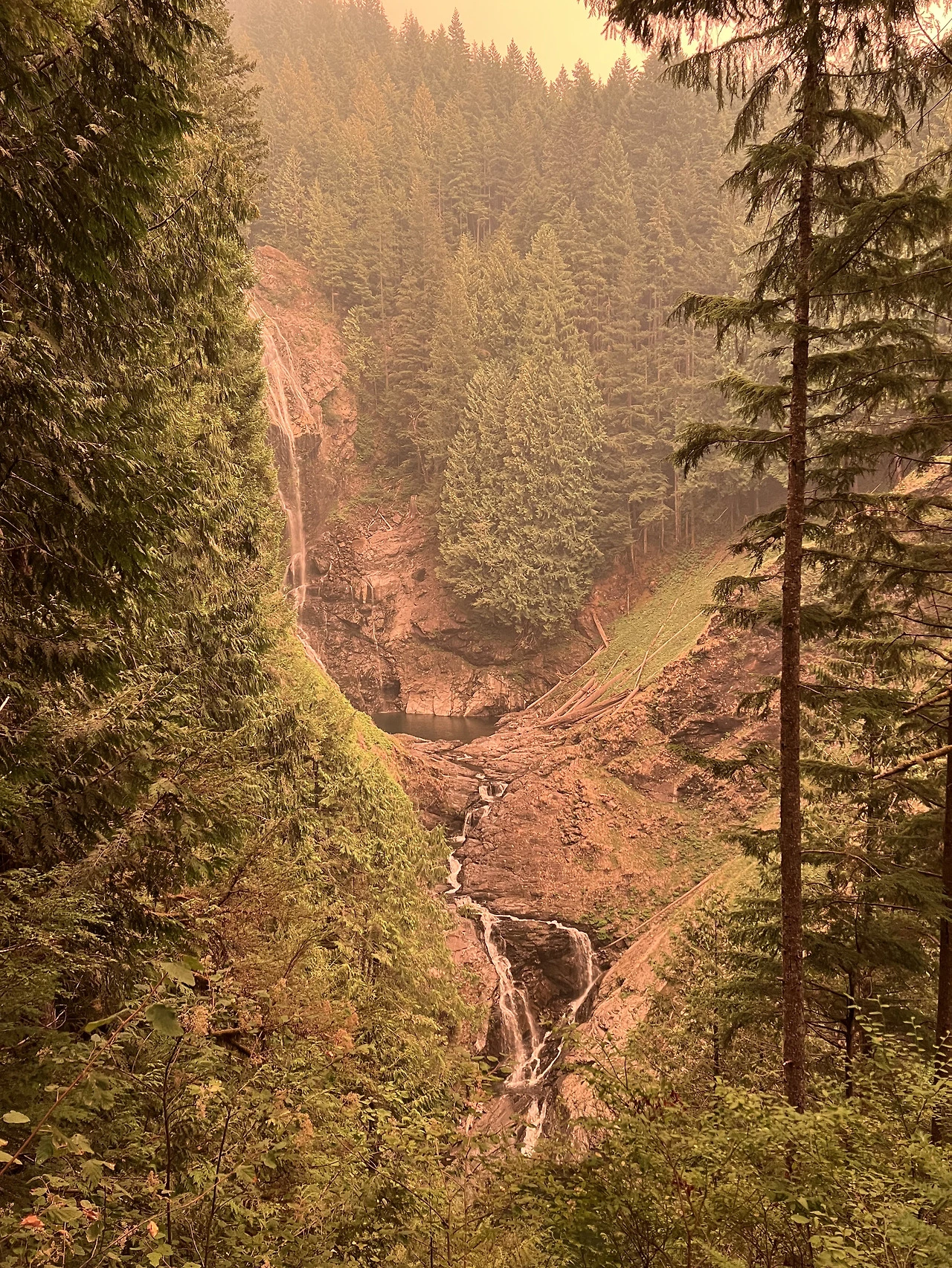 이상하게 매캐한 냄새가 난다고 생각이 들었을 때쯤, 이미 목이 따끔따끔하고, 머리가 아프기 시작했다. 지금생각하면 이미 산불 연기에 포함되어 있는 여러 유해물질과 미세먼지 때문이었을 텐데, 우리는 무슨 일이 생기고 있는지 모른 채 계속 산을 올랐다. 하늘이 좀 붉어지는 것 같고, 공기도 탁해지는 느낌이라 주변에 산불이라도 난 건가 하는 생각을 잠깐 했지만, 이미 핸드폰이 안 터지는 지역에 들어와 있어서 (시애틀뿐만 아니라 미국 전역에서 하이킹을 가면 아직도 핸드폰이 안 터지는 지역이 많다.) 정확하게 어떤 상황인지 몰랐고, 어서 Upper Wallace Falls를 보고 내려가자는 생각뿐이었다.