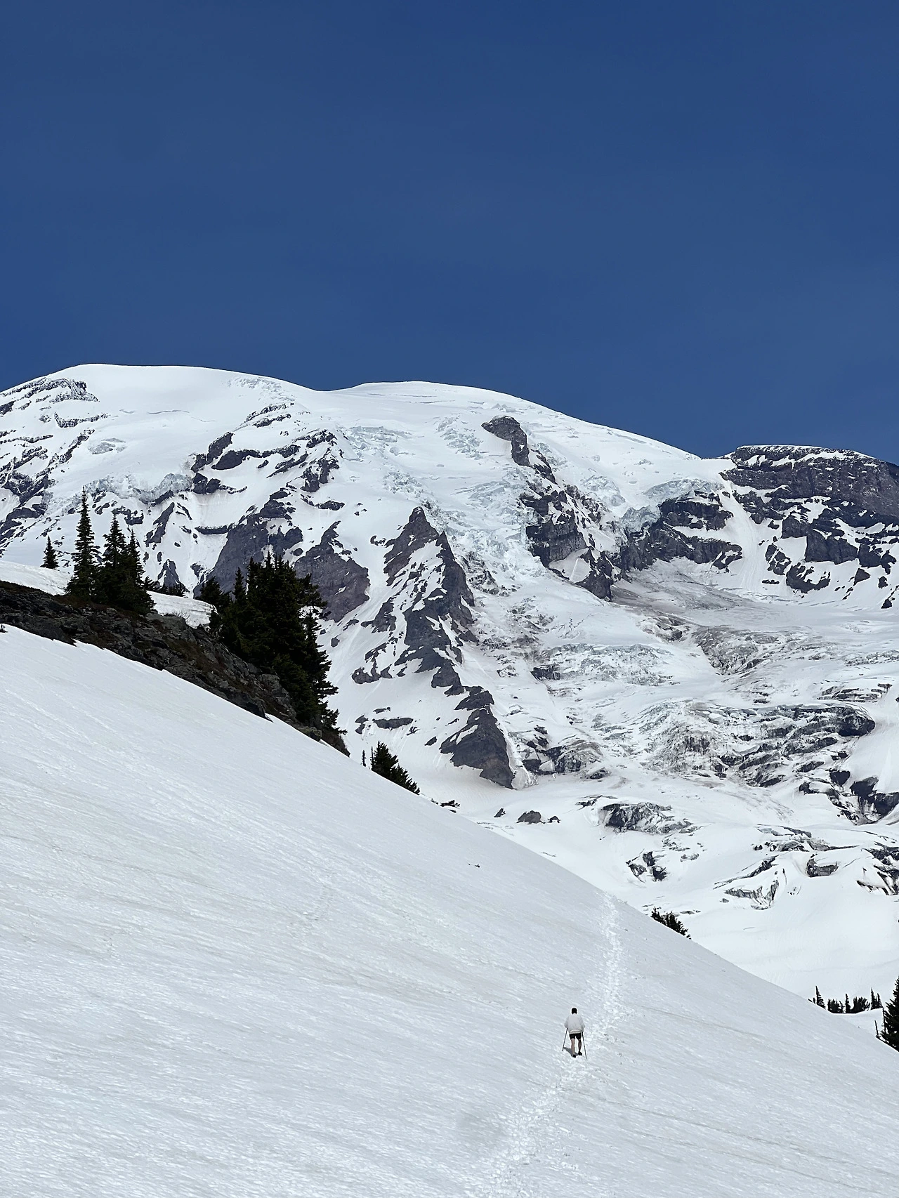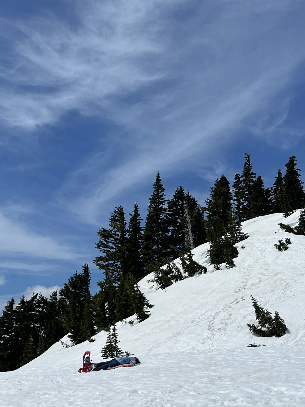 올라도 올라도 산은 끝이 없고, 사방이 하얗다. 시애틀 도심은 Heat Wave 때문에 한 여름처럼 더웠는데, 이곳은 타임머신을 타고 다시 겨울로 돌아온 것처럼 새하얀 눈에 둘러싸여 있는 게 새삼 재밌다. 분명 눈 위를 걷고 있는데 머리 위로는 뜨거운 태양이 비추고, 하늘은 새파랗고, 나무는 초록초록한 그런 신기한 곳이다.