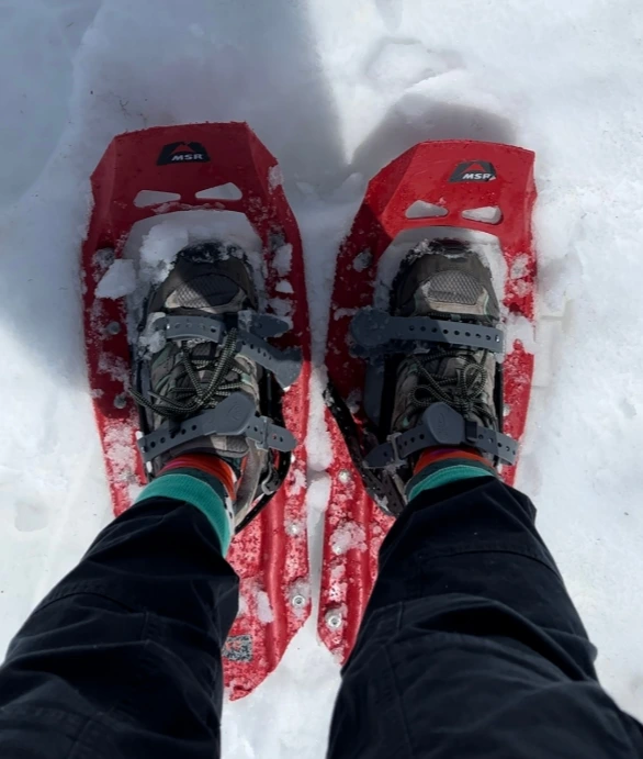 사진에서 보는 것처럼, 5월 중순인 게 무색할 정도로 사방이 눈이었다. 파라다이스 캠프 주차장에서 출발하는 순간부터 모든 트레일이 눈에 덮여있어서 그냥 무작정 걷기가 불가능했기 때문에 우리는 스노우 슈잉 (Snowshoeing)을 하기로 했다. 스노우 슈잉(Snowshoeing)이란 눈 덮인 지형을 걷는 겨울 액티비티로 신발 위로 스노우 슈즈(snowshoes)를 신고 눈 위를 걷는 활동이다. 스노우 슈즈는 얼핏 보면 짧은 스키처럼 보이기도 하는데, 스키처럼 미끄러지는 기능은 없고, 발 표면적이 넓은 스노우 슈즈를 신어서 눈 속에 발이 빠지지 않고 그 위를 걸을 수 있게 도와주는 장비라고 할 수 있다. PNW의 취미생활의 하나로 겨울에 스노우 슈잉을 취미로 하는 사람도 많다고 들었는데, 다행히 파라다이스 캠프에 있는 Visiter Center에서 스노우 슈즈를 빌릴 수 있어서, 하이킹만 생각하고 온 우리도 스노우 슈잉에 도전할 수 있었다.