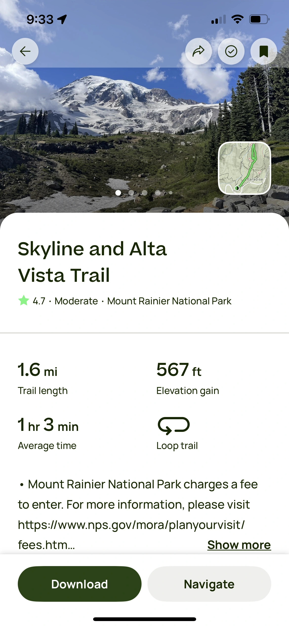 한국에서 가족들이 방문했다. 가족들이 시애틀에 오는 건 처음이라, 엄청난 대자연을 보여줘야 한다는 생각으로 Rainier National Park (레이니어 국립공원)에서 1박 2일을 보내기로 했다. 이제까지 소개한 레이니어 국립공원 안의 다양한 하이킹 코스들 - Burroughs Mountain Trail, Naches Peak, Tolmie Peak 등 - 중에 어디를 고를까 고민했지만, 아직 5월이라 도로가 막혀있거나 열지 않은 트레일이 대부분이라 옵션이 많지 않았다. 고심 고심 끝에 고른 곳은 레이니어 국립공원의 대표적인 2개의 베이스캠프 중 남쪽에 있는 파라다이스 (Paradise) 캠프에서 출발하는 세 개의 하이킹 트레일이었다.