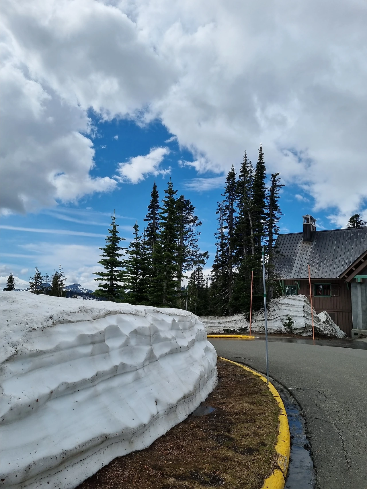 트레일에서 다시 주차장에 돌아와 보니 주차장 옆에 깔끔하게 정리된 눈 벽이 족히 1미터~1.5미터는 넘는 것 같다. 겨울을 지나면서 쌓이고 쌓인 눈이 압축되면서 단단한 눈 벽을 만든 것을 잘라놓으니 눈의 단층에서 나무의 나이테 같은 결이 보여서 신기했다.