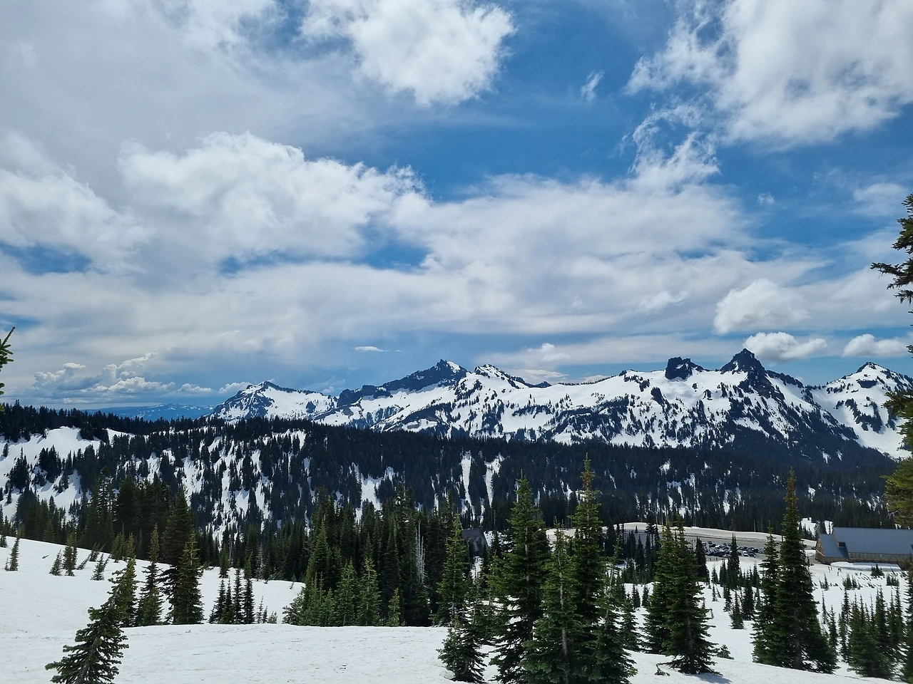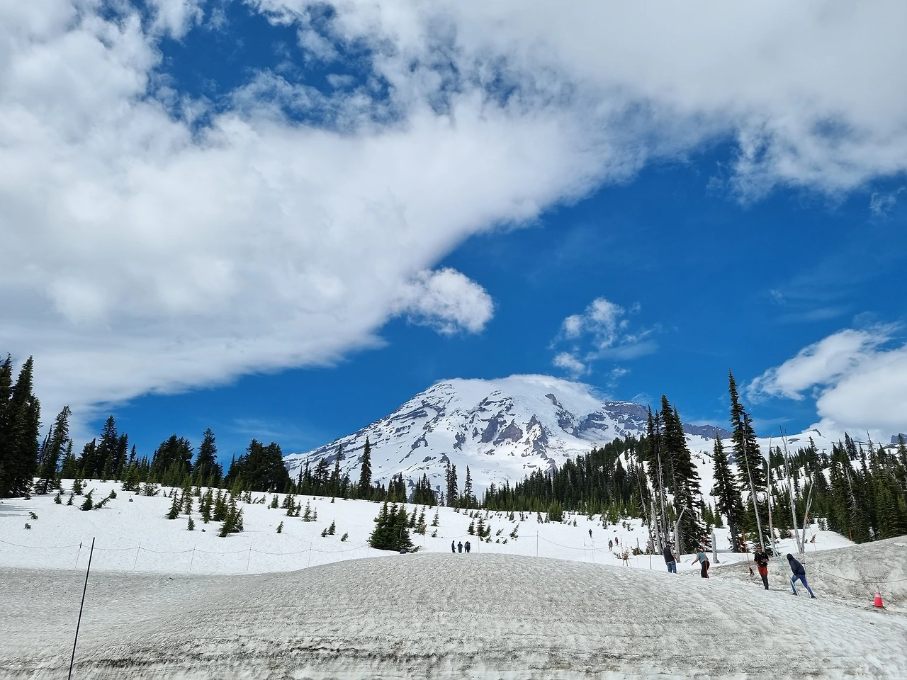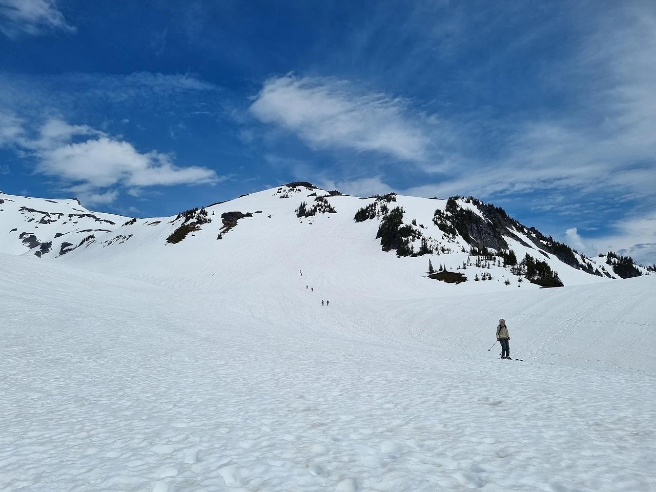 스노우 슈즈를 신었다고, 산에 뚝딱뚝딱 올라지는 건 아니었다. 5월 중순에 이례적으로 온 Heat Wave (히트 웨이브, 시애틀의 열파로 여름철 동안 비정상적으로 높은 기온이 지속되는 현상)로 갑자기 엄청 더운 일주일이 지속되면서 눈의 표면이 많이 녹아 트레일의 출발지는 슬러시에 가까운 상태였다. 게다가 모든 트레일이 눈으로 덮여있어서, Skyline and Alta Vista Trail라고는 했지만, 딱히 어디가 길인지 잘 확인도 되지 않았다. 그냥 길로 추정되는 곳으로 조심스럽게 한발 한발 올라 그 뷰를 감상할 뿐이었다. 어떤 사람들은 스노우 슈즈를 신고, 배낭에는 스키를 메고 산을 올랐다. 스노우 슈잉으로 산을 오르고 스키를 타고 산을 내려오는 것이다. 한국에서는 좀처럼 보기 힘든 재미있는 광경이다.