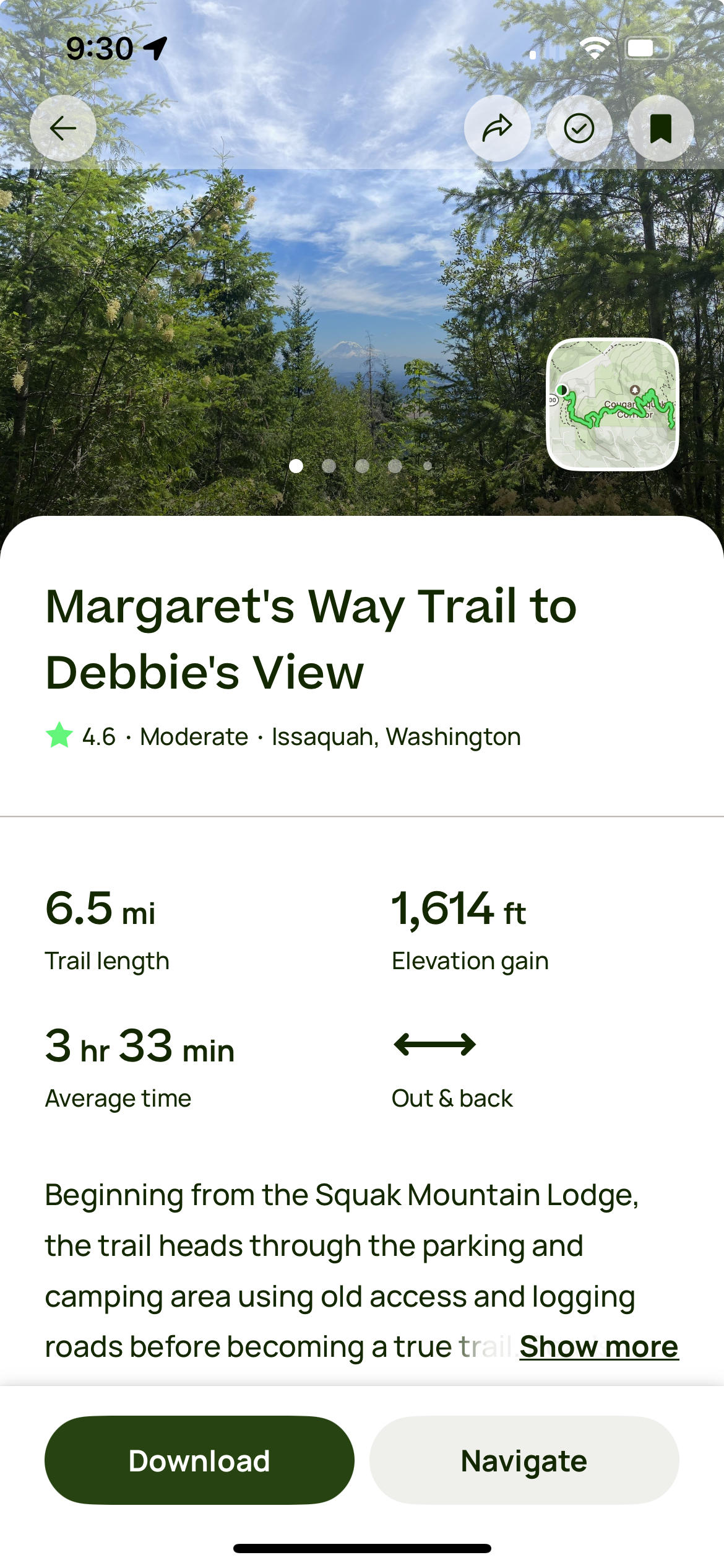 이런 조건들을 모두 생각하다가 오늘의 하이킹 장소로 선택한 곳이 Margaret's Way Trailhead이다. 시애틀 다운타운 기준으로 차가 안 막히면 25분이면 갈 수 있는 시애틀 근교의 이사콰(Issaquah)라는 곳 근처에 Squak Mountain(스콰크 산)에 있는 곳으로, 일단 가까운 곳일 것이라는 첫 번째 조건을 완벽하게 만족한다. Elevation(고도)이 1614피트(약 492미터)라고는 하지만, 평평한 트레일을 천천히 걷는 느낌이라 난이도는 쉬움에 가깝다. (AlTrails의 난이도에 속지 말자!) 아무래도 도심과 가까운 곳이라 오르는 동안 엄청난 뷰가 있거나 볼거리가 있는 편이 아닌데도 이 트레일을 선택한 이유는 정상에서 레이니어 산이 (Mt.Rainier) 보이는 스팟이기 때문이다.