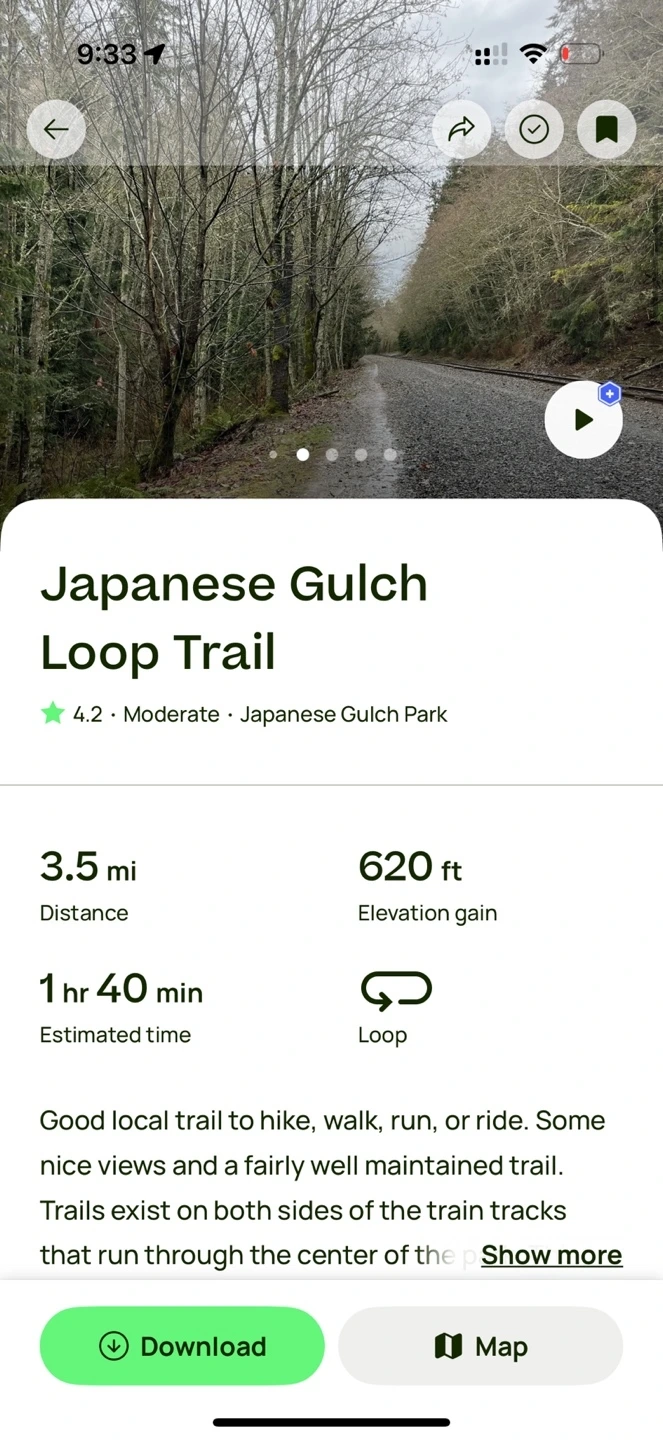 기찻길이 Japanese Gulch Conservation Area(보호지역)을 가르며 지나가고 있어서, 트레일이 동서로 나눠져 있다. AllTrails앱에서 Japanese Gulch Loop Trail을 선택해서 따라가면 기찻길의 동쪽코스를 돌고 내려와서 서쪽코스로 돌아오는 길을 따라 하이킹이 가능하다.(반대로도 물론 가능하다.)