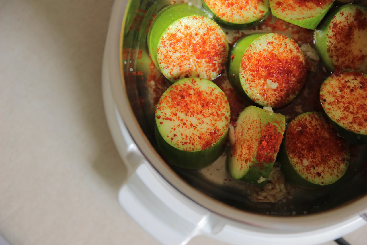 3. 팬에 호박을 넣고 고춧가루를 뿌린 뒤 새우와 마늘을 넣어준다.