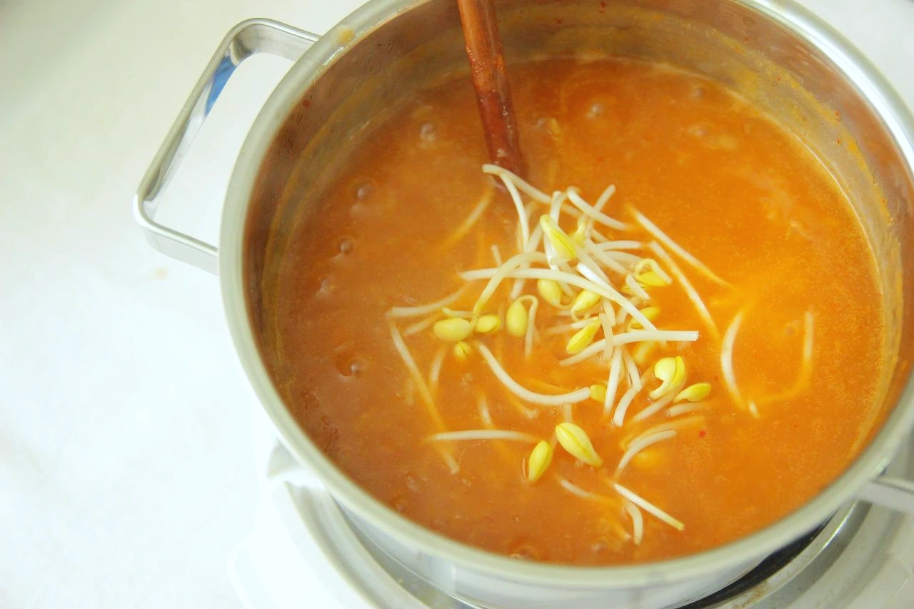 9. 쌀알이 푹 퍼질 때까지 끓이다가 콩나물을 넣고 숨이 죽을 때 불을 꺼준다.
