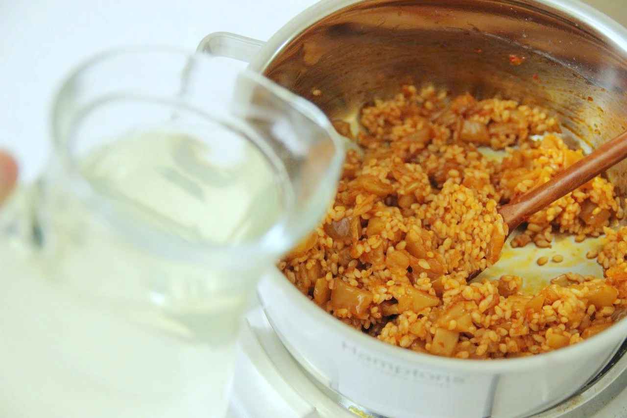 7. 김치의 물기가 남아있는 상태에서 불린 쌀을 넣고 볶아준다. (불은 중약불)