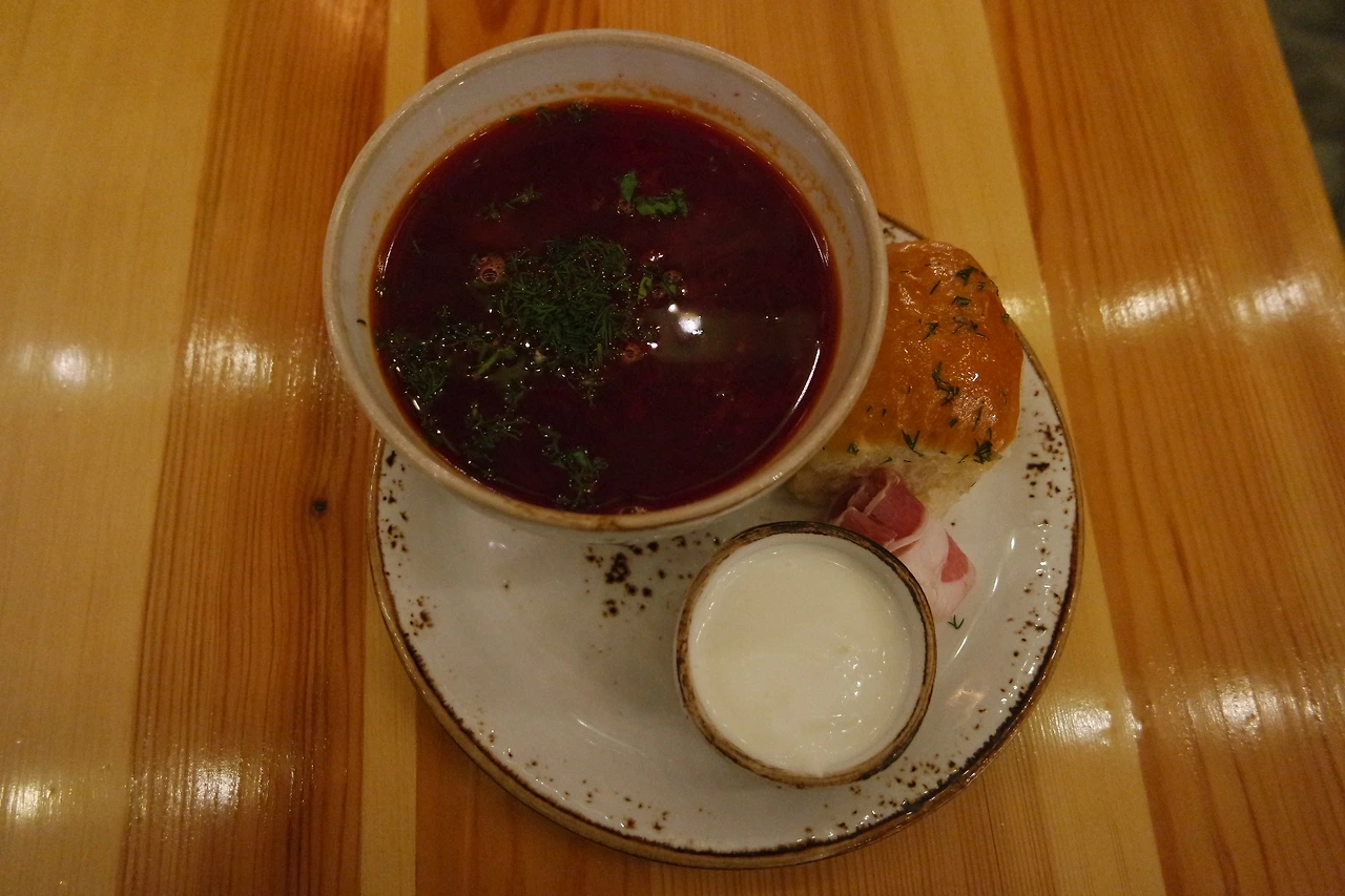 블라디보스토크가 인기 관광지로 알려지게 되면서 러시아의 음식들도 우리에게 많이 소개되었다. 가장 유명한 것은 보르시다. 유독 핑크색의 가까운 붉은 빛을 띤 스프로 처음에는 무슨 맛일지 짐작도 가지 않지만 막상 먹어보면 매우 익숙한 맛을 느낄 수 있다. 보르시치가 붉은 색을 띠는 것은 비트의 색이 묻어나왔기 때문이다. 비트는 무의 한 종류로 보르시는 이 비트와 소고기를 듬뿍 넣고 끓인 스프다. 누군가는 김치찌개 맛과 비슷하다고 하지만 나는 소고기 무국과 같은 맛이 났다. 여기에 러시아의 사워크림인 스메타나를 넣어 먹으면 보다 현지에 가까운 맛을 느낄 수 있다. 러시아인들은 스메타나를 소스로 자주 쓰는데 고열량인 사워크림을 자주 먹는 것은 시베리아의 추운 날씨 때문인 것 같다. 추운 날씨를 견디는 데에는 고지방의 음식이 제일이다. 고지방 음식을 많이 먹게 되면 내 몸에도 두툼한 지방옷이 생긴다. 그러면 추위를 견디기 조금 더 쉬워지겠지. 스메타나 소스를 풀어 넣기 전에는 담백하고 시원한 맛이었는데 스메타나 소스를 푸니 고소하면서도 진한 맛을 느낄 수 있었다.