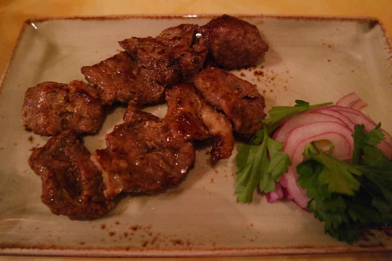 두번째 음식은 샤슬릭이다. 쉽게 말하면 꼬치 요리다. 동물의 고기를 쇠꼬챙이에 끼워 불에 구워먹는 요리다. 어쩌면 인간이 고기를 요리하는 가장 오래된 방식일지도 모른다. 시베리아 지역에서 방금 사냥한 짐승의 고기를 투박하게 잘라 나뭇가지에 끼워 불가에서 구워먹었을 모습이 상상된다. 솔직히 말하자면 이런 종류의 요리는 불에 구워지면서 기름기가 빠지기 때문에 담백하면서도 불맛까지 나 맛이 없을 수가 없다.