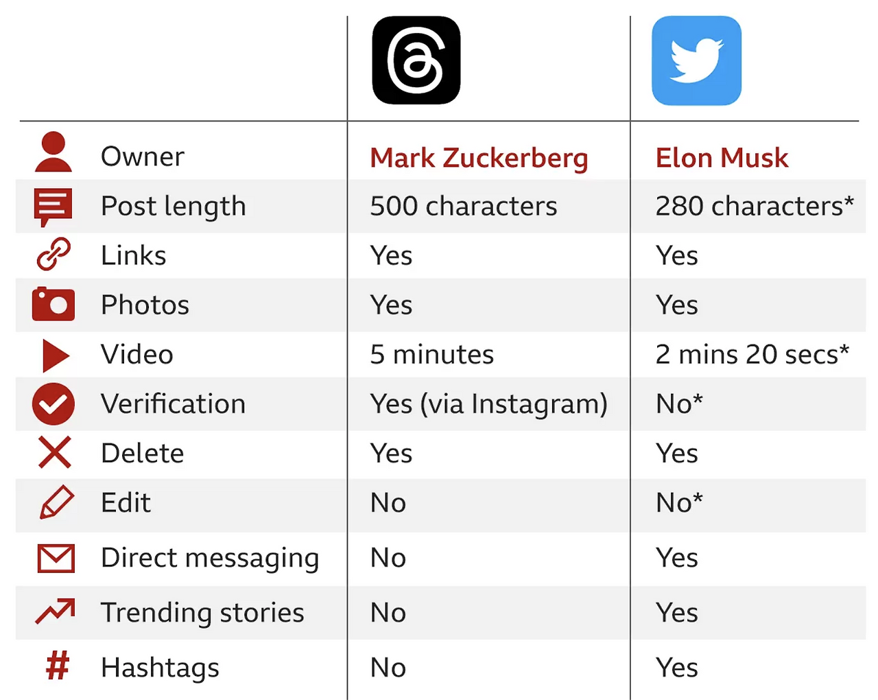 머스크는 자신의 플랫폼에서 "스레드(Threads)"라는 단어가 전 세계적으로 유행하자 "고통을 숨기는 인스타그램의 거짓된 행복에 빠지는 것보다 트위터에서 낯선 사람의 공격을 받는 것이 훨씬 더 낫다"라고 말했다.